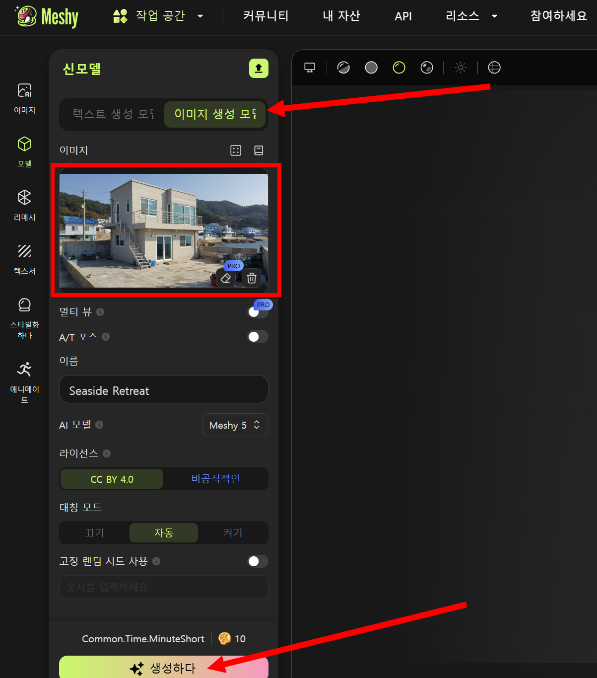 11)소스 이미지를 사용하여 3D 모델을 생성하려면 이미지 생성 모델을 선택하고 소스 이미지를 업로드한후에 3D 모델을 생성합니다.