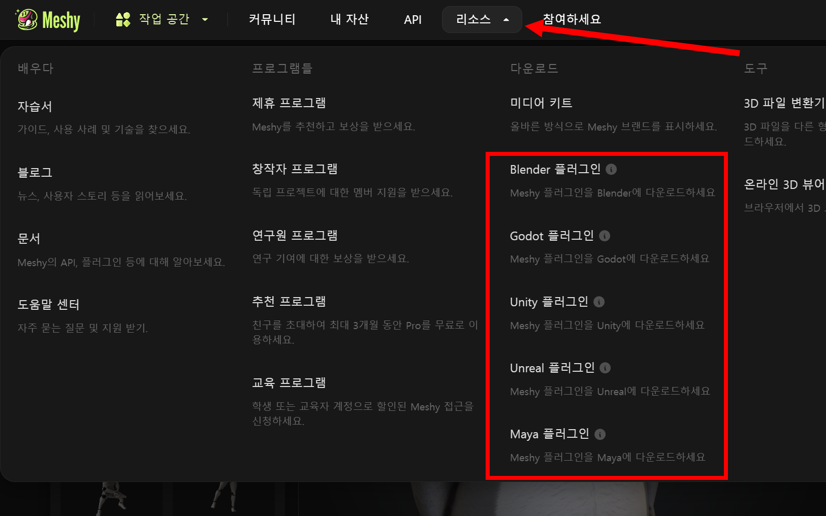24)상단의 리소스 메뉴에서 게임 엔진(Unity, Unreal), 3D 프로그램(블렌더, 마야, 기타)을 위한 Meshy AI 플러그인이 제공되는것을 확인할수있습니다.