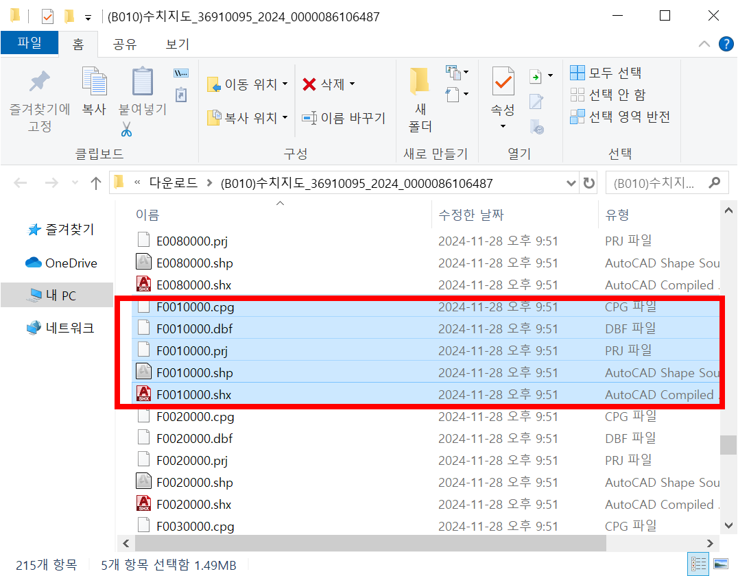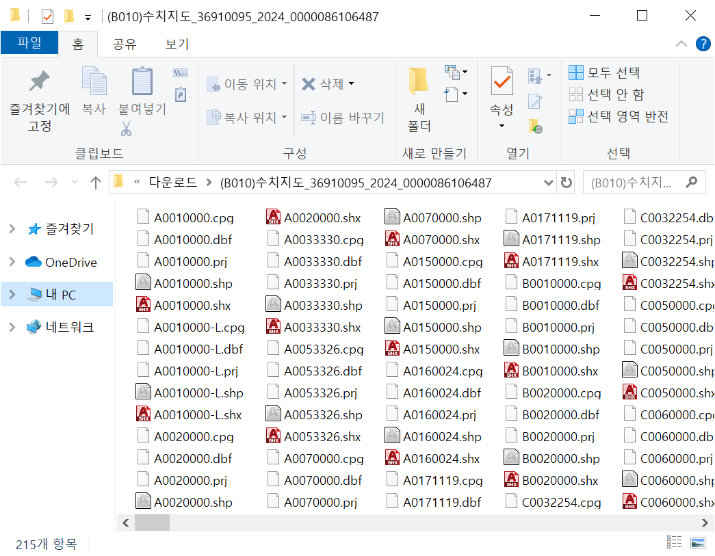 3)다운로드한 수치지도 파일 목록을과 수치지도 파일 구성을 확인합니다(cpq, dbf, prj, shp, shx)