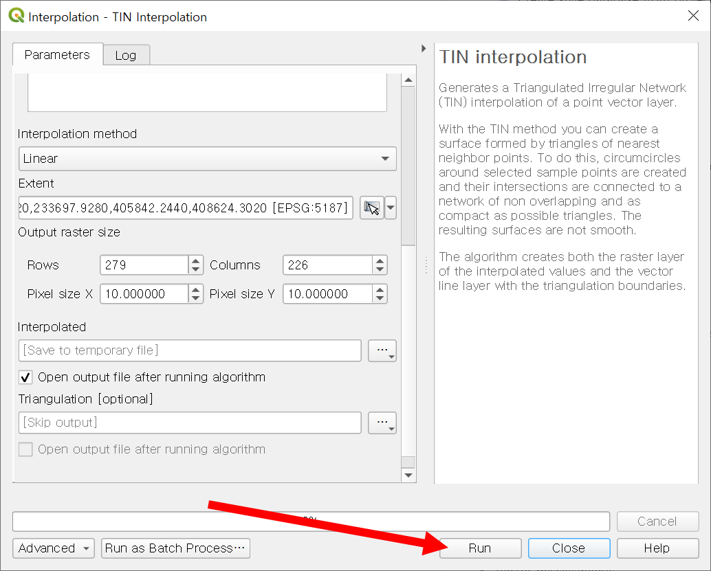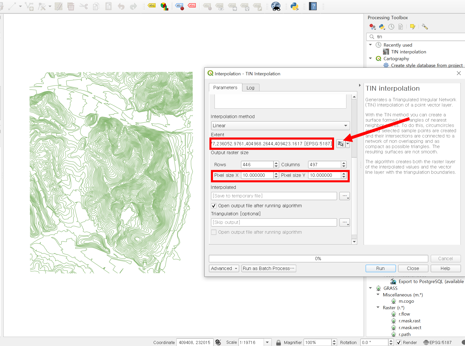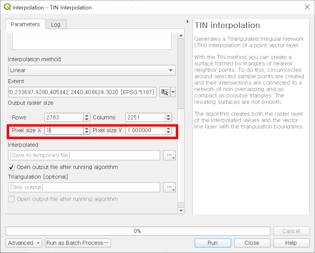 14) TIN interpolation에서 Pixel Size X, Y 수치를 낮추고 실행합니다(Run)