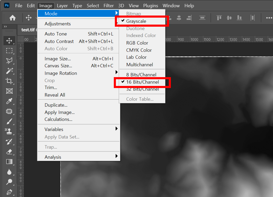 19)상단의 image 메뉴에서 mode의 grayscale, 16 bits/channel에 체크합니다.