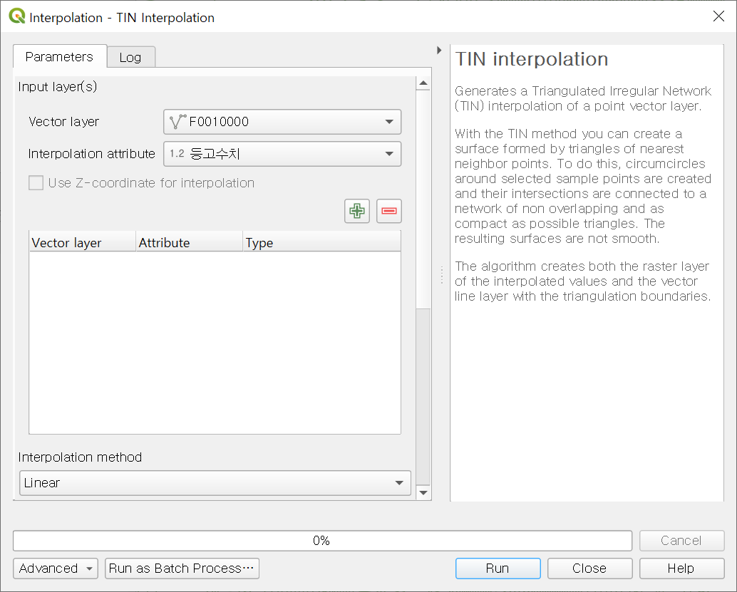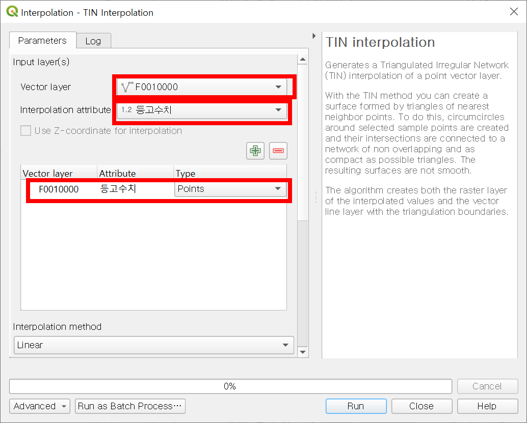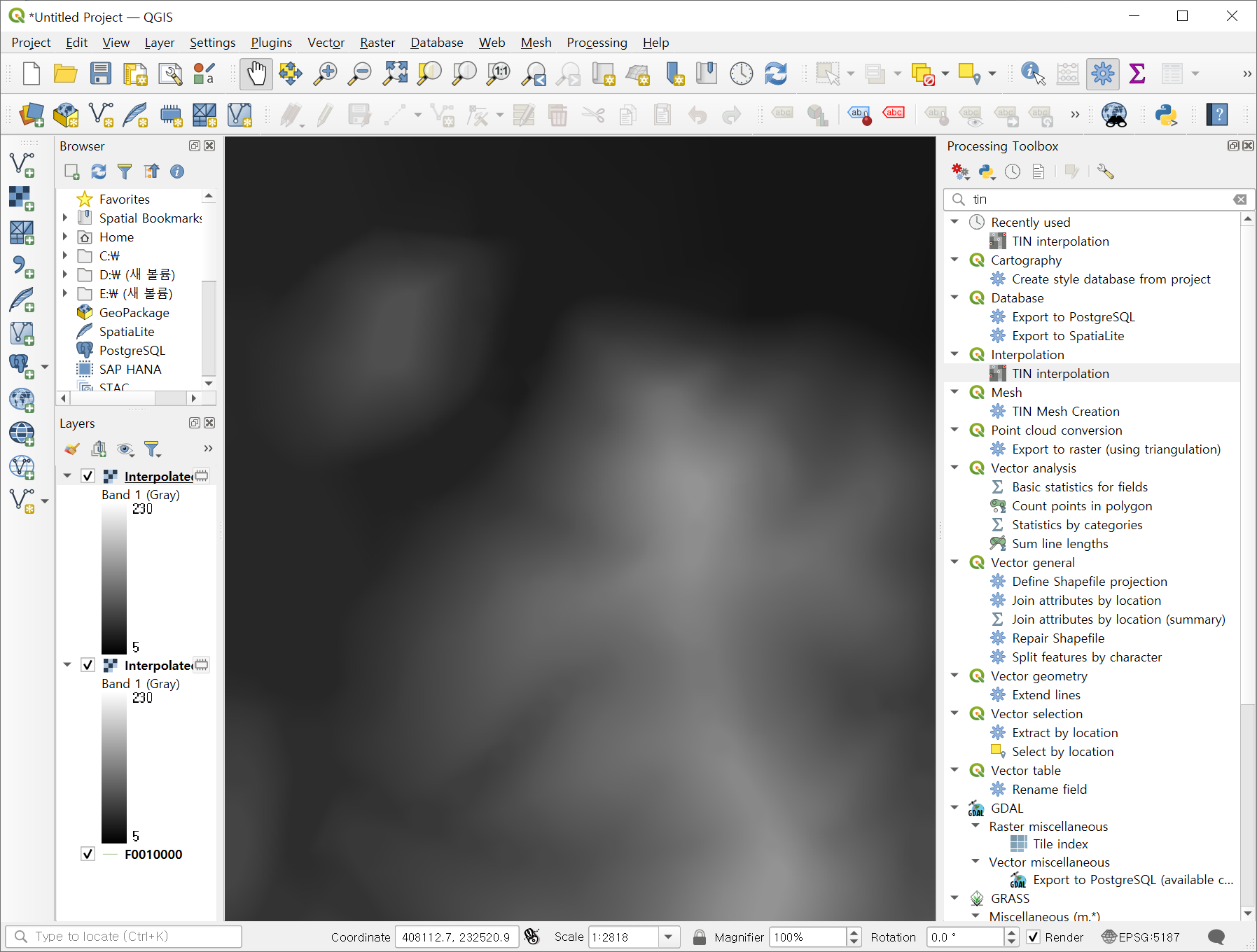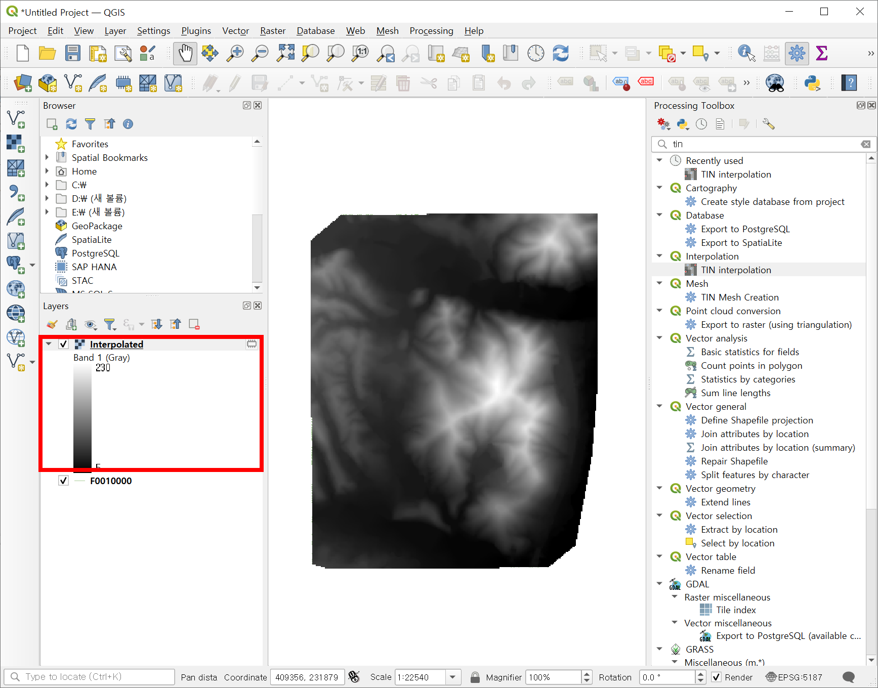 QGIS에서 수치지도를(shp) 사용하여 등고선의 지표면 이미지 만들기(TIN Interpolation)