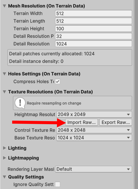 24)texture resolutions에서 import raw를 클릭하고 RAW 파일을 가져오기합니다.