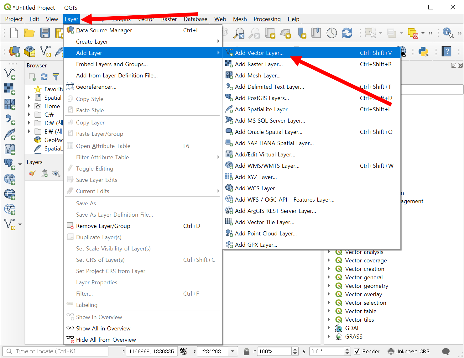5)QGIS 상단의 layer 메뉴에서 add layer 의 add vector layer를 선택합니다.