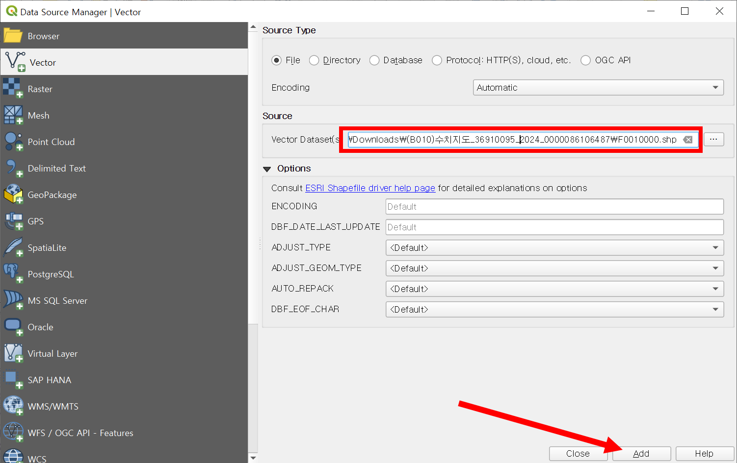 6)벡터 레이어 추가의 소스(source)에서 수치지도의 shp 파일을 선택하고 추가합니다(add)