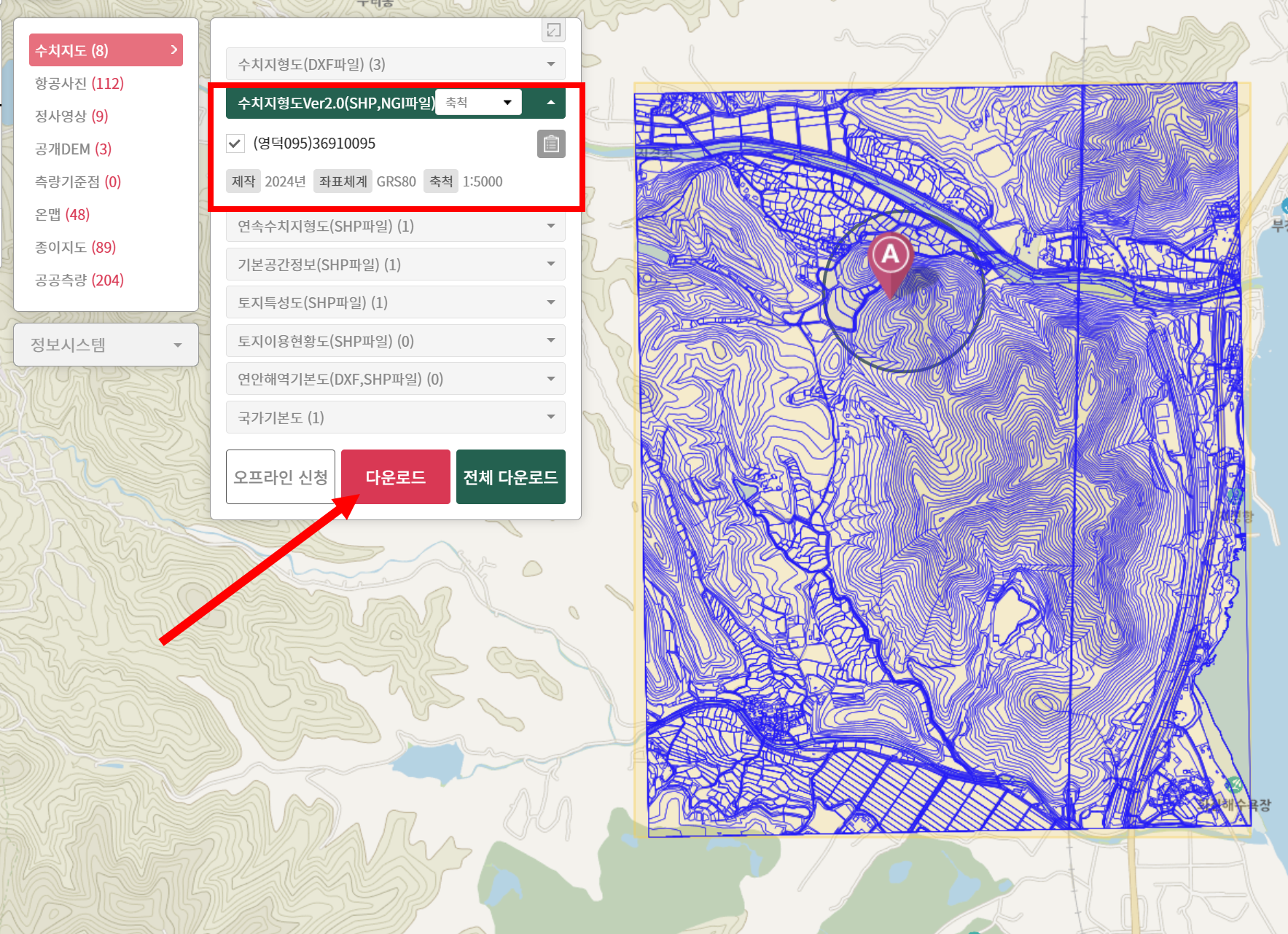 2)검색결과에서 수치지형도 Ver2(SHP, NGI)를 선택하고 대상 지역을 확인 및 다운로드합니다.