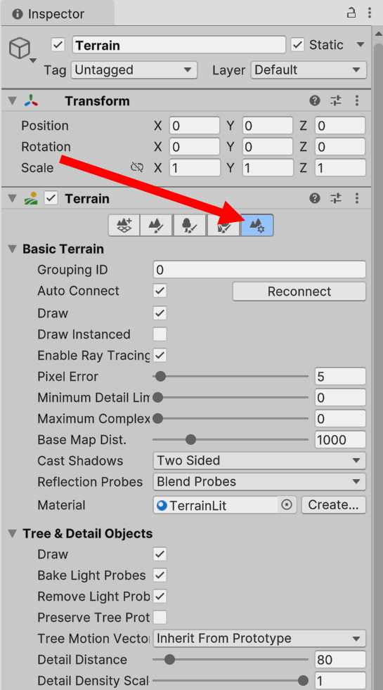 23)유니티 엔진에서 씬에 터레인(terrain)을 생성하고 설정(settings)로 이동합니다.