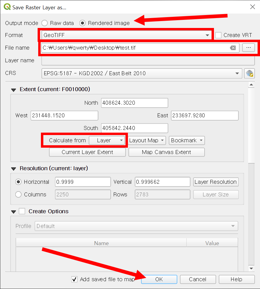 17)save raster layer as에서 상단의 rendered image를 선택하고 포맷 및 파일 이름을 설정하고 확인합니다(geoTIFF, .tif)
