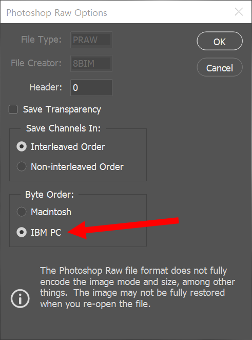 22)파일 저장 옵션의 바이트 순서(Bite Order)에서 IBM PC를 선택하고 저장합니다.