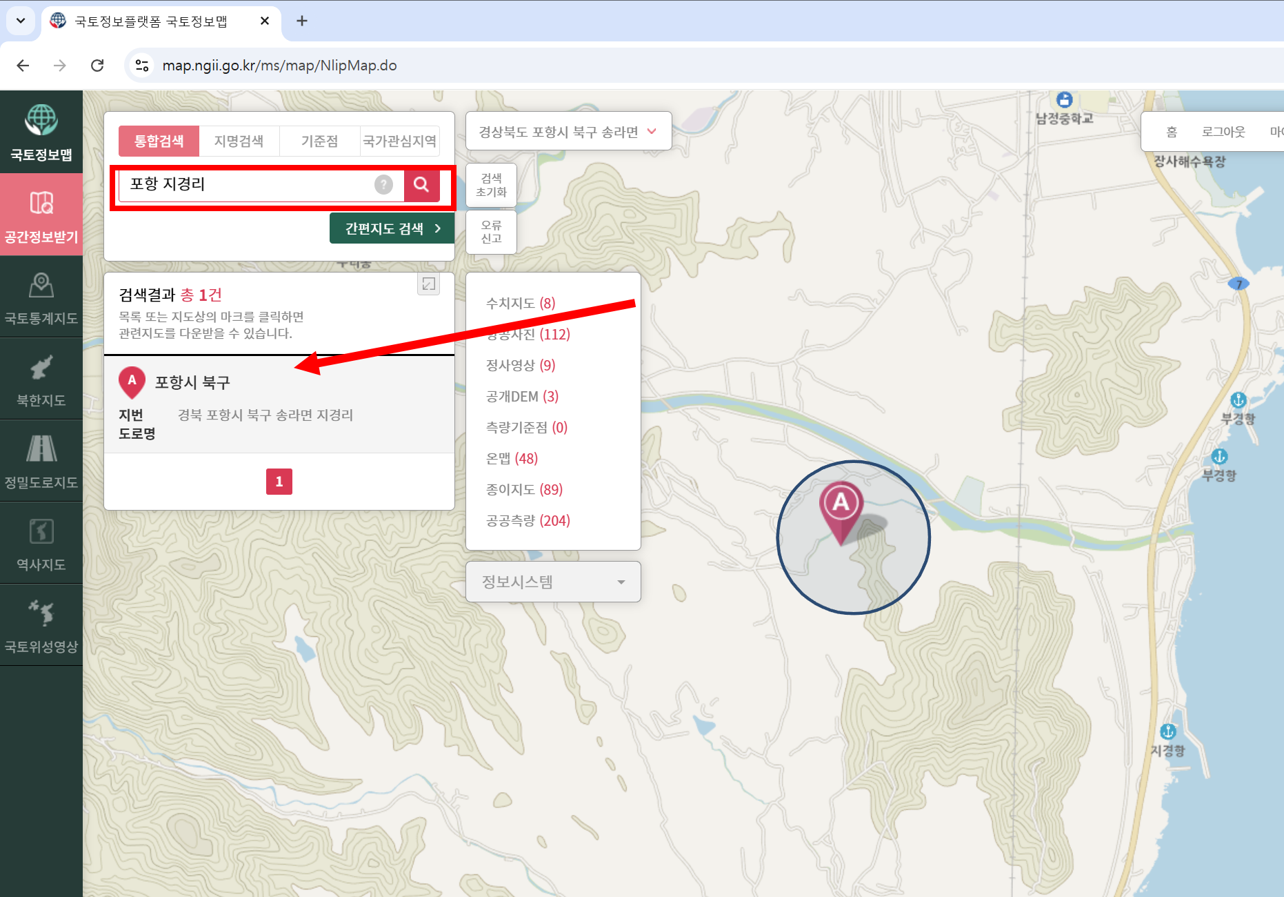 1)국토정보플랫폼 국토정보맵 웹사이트로 이동하여 지도에서 지역 및 주소를 검색합니다.