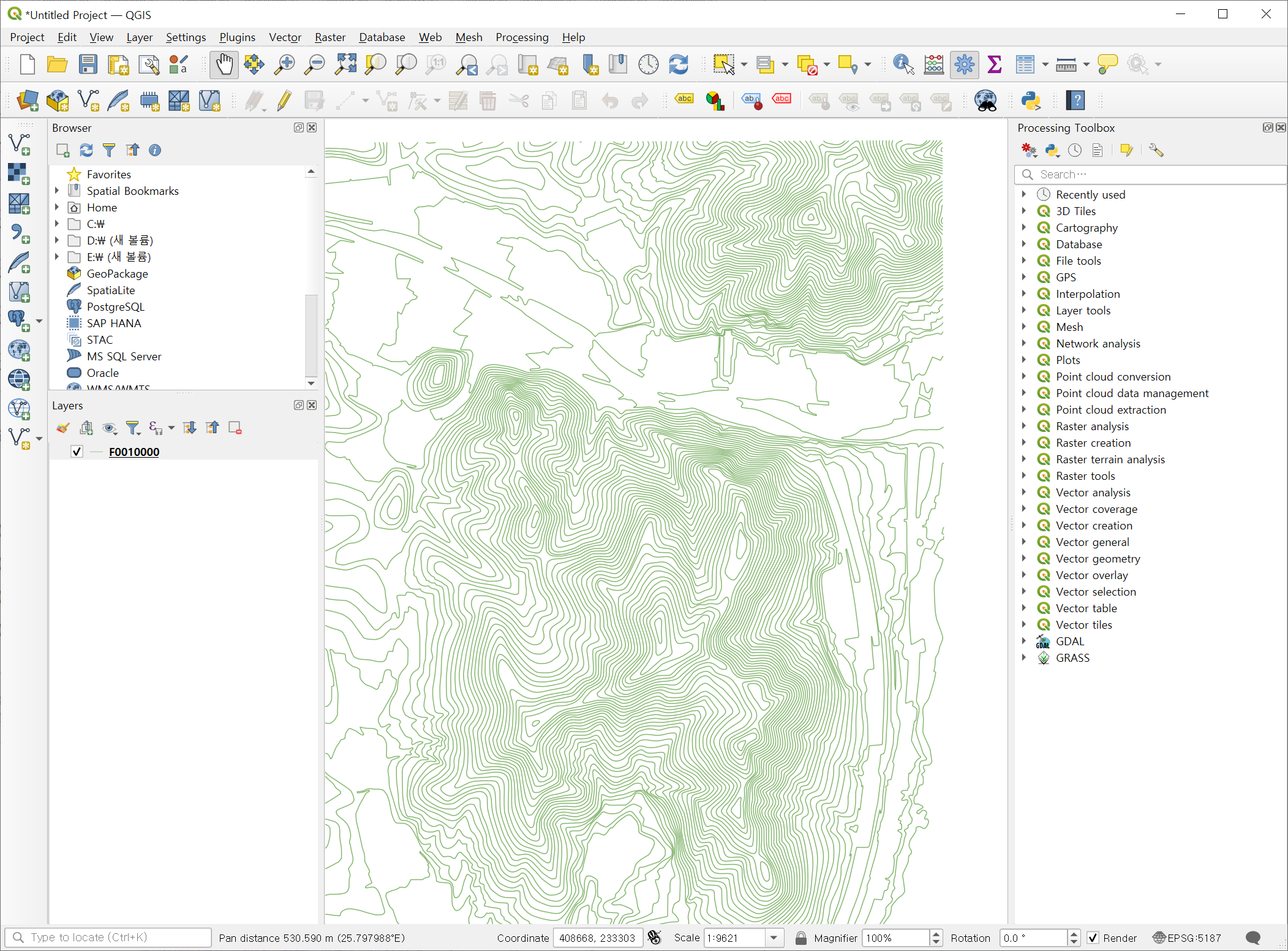 7)벡터 레이어가 추가되었으며 선(line)으로 표현되는 등고선을 확인할수있습니다.