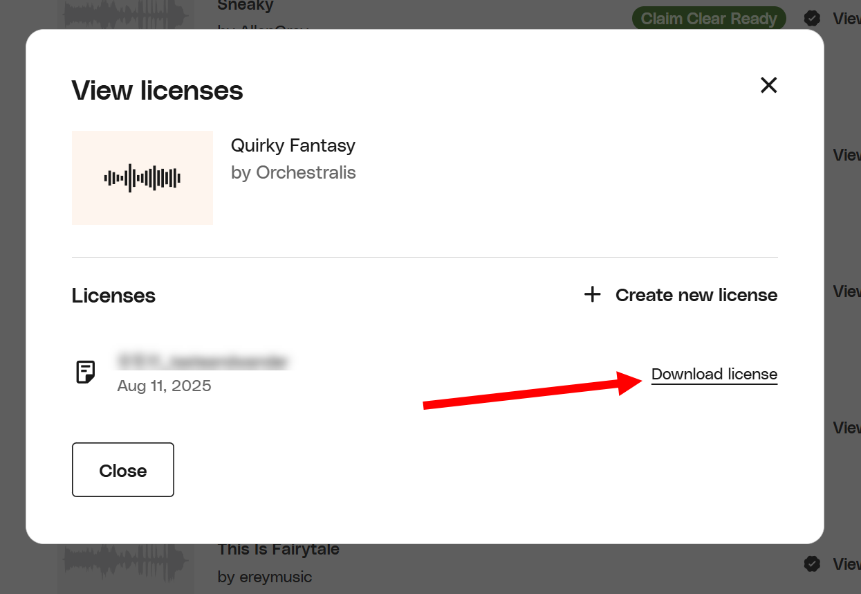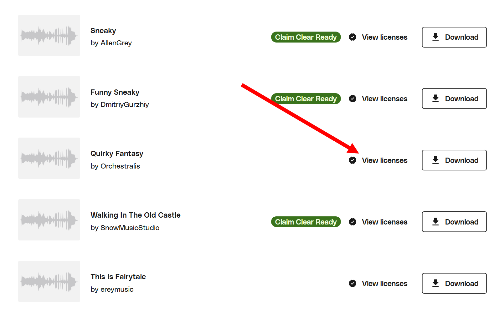 9)해당 음원의 라이센스 보기로 이동합니다(view licenses)
