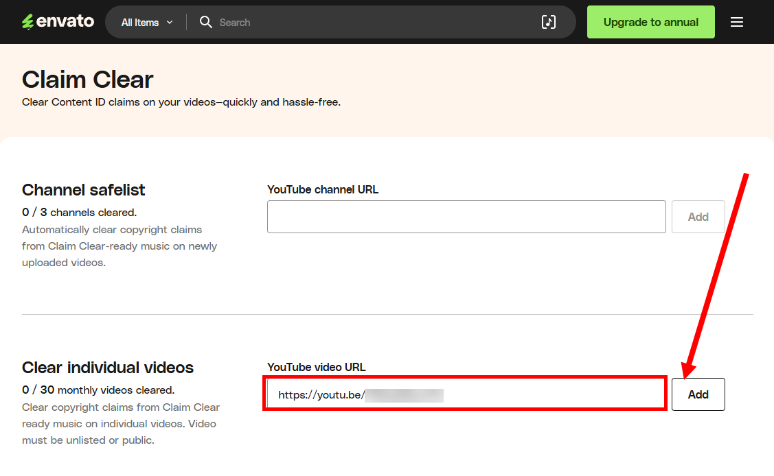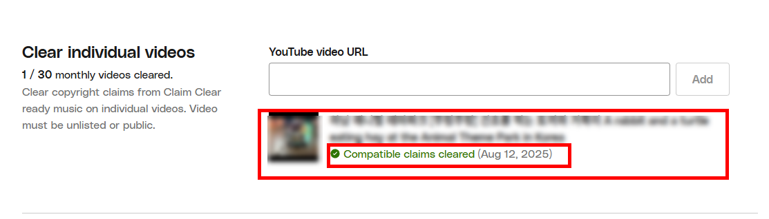 4)개별 비디오에 대한 저작권 클레임을 해제하려면 Clear indicidual videos에서 해당 동영상의 유튜브 비디오 URL(YouTube video URL)를 입력하고 추가합니다.