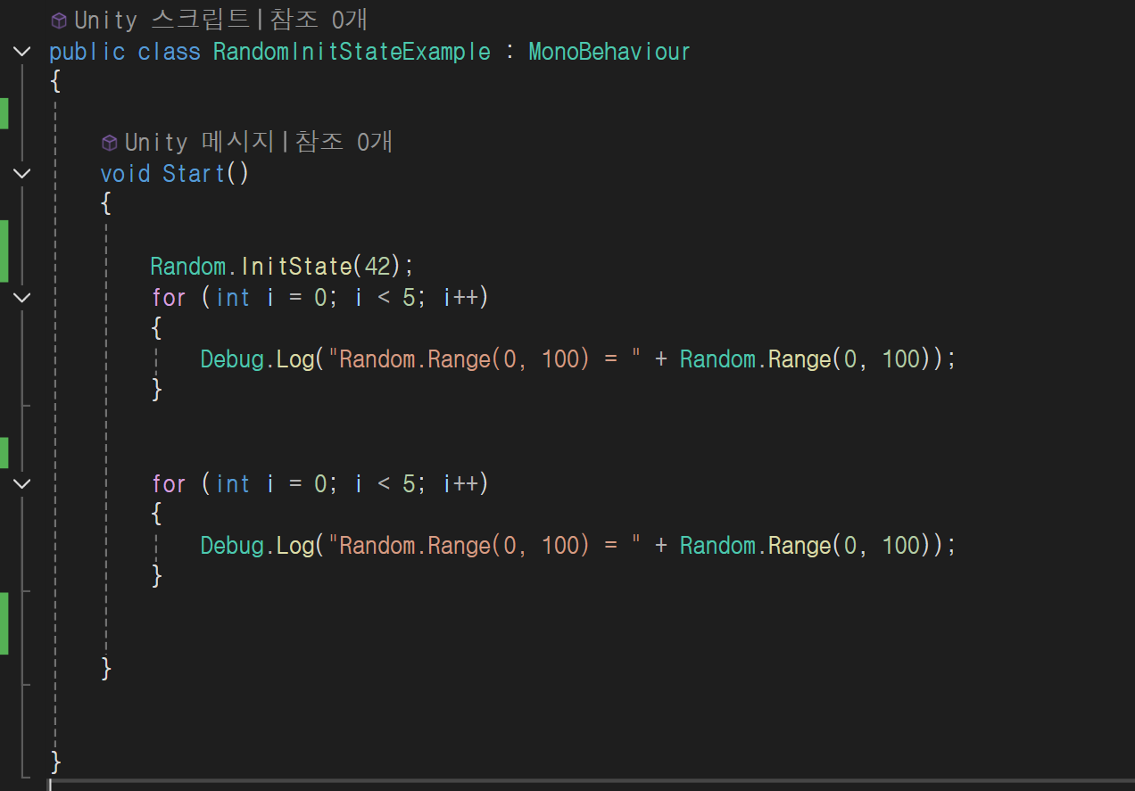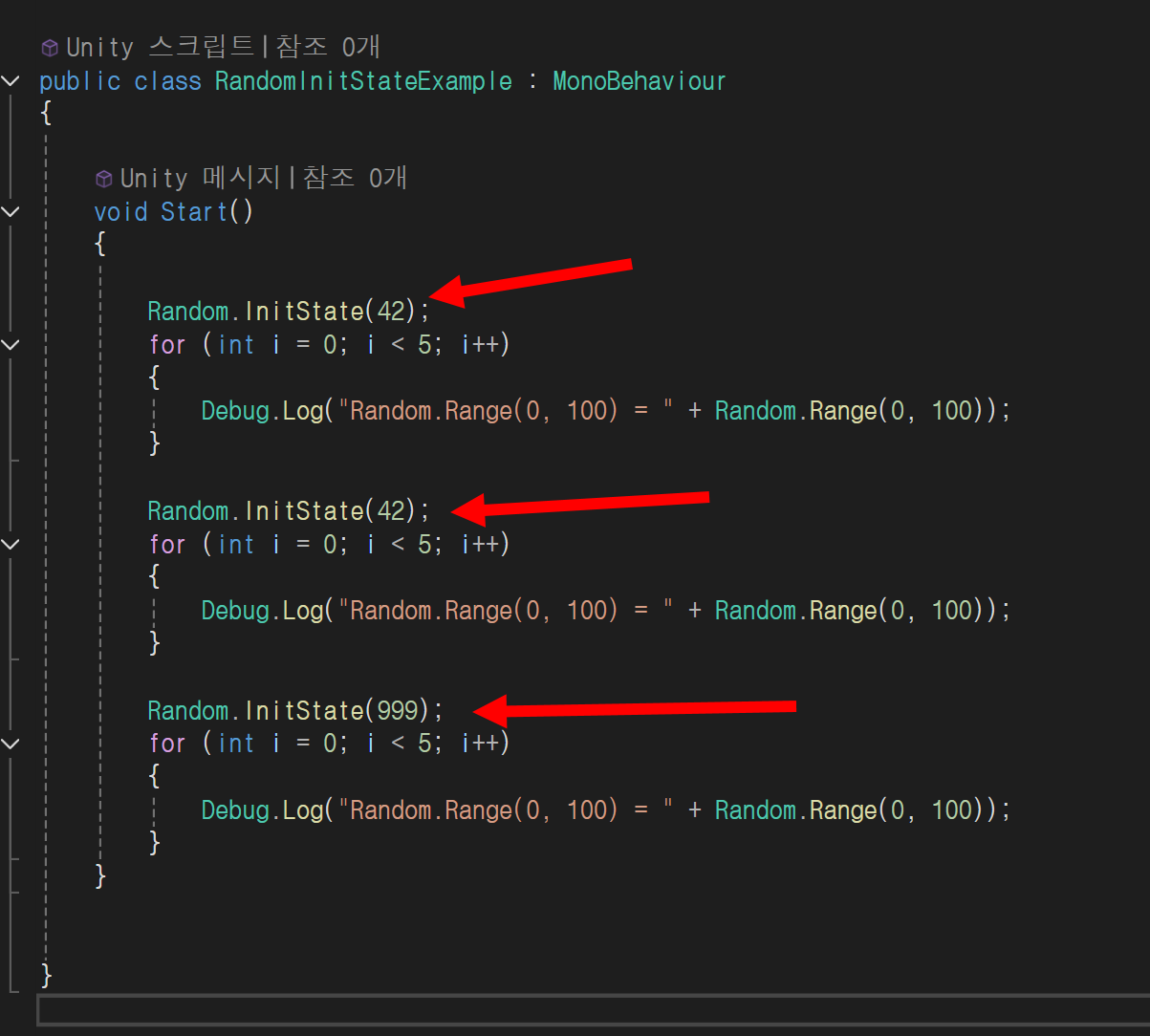 4)Random.InitState(42) 호출 시점에서 Unity의 전역 랜덤 상태가 시드(seed) 42 값으로 초기화됩니다.
