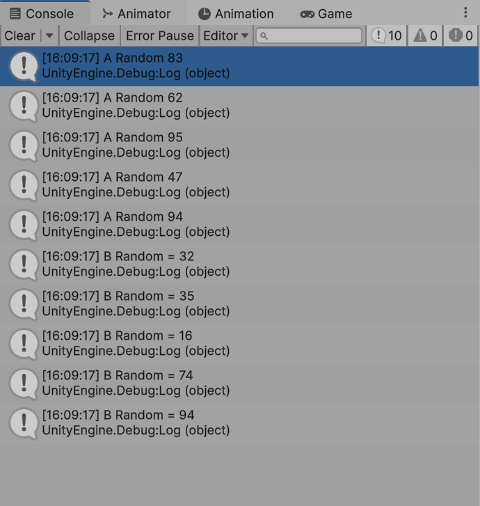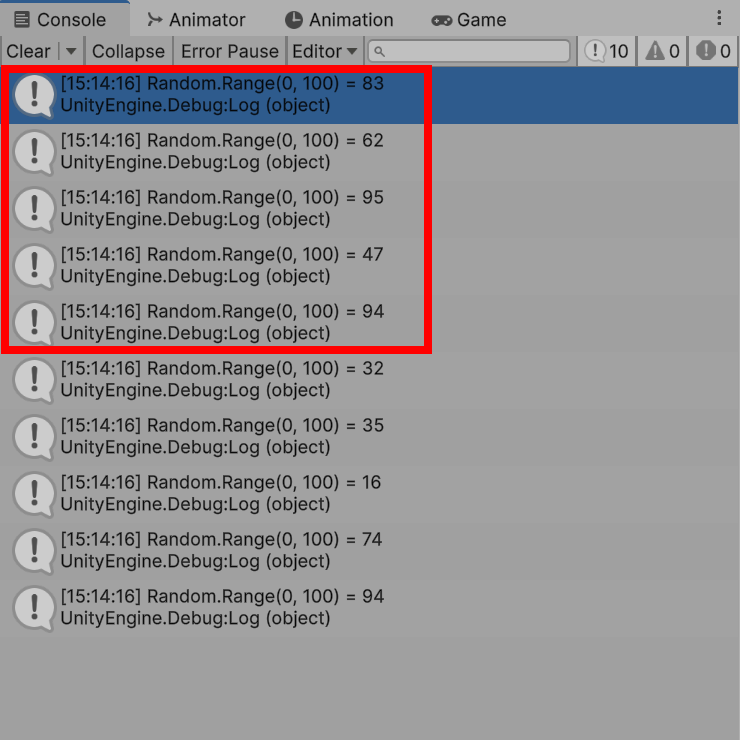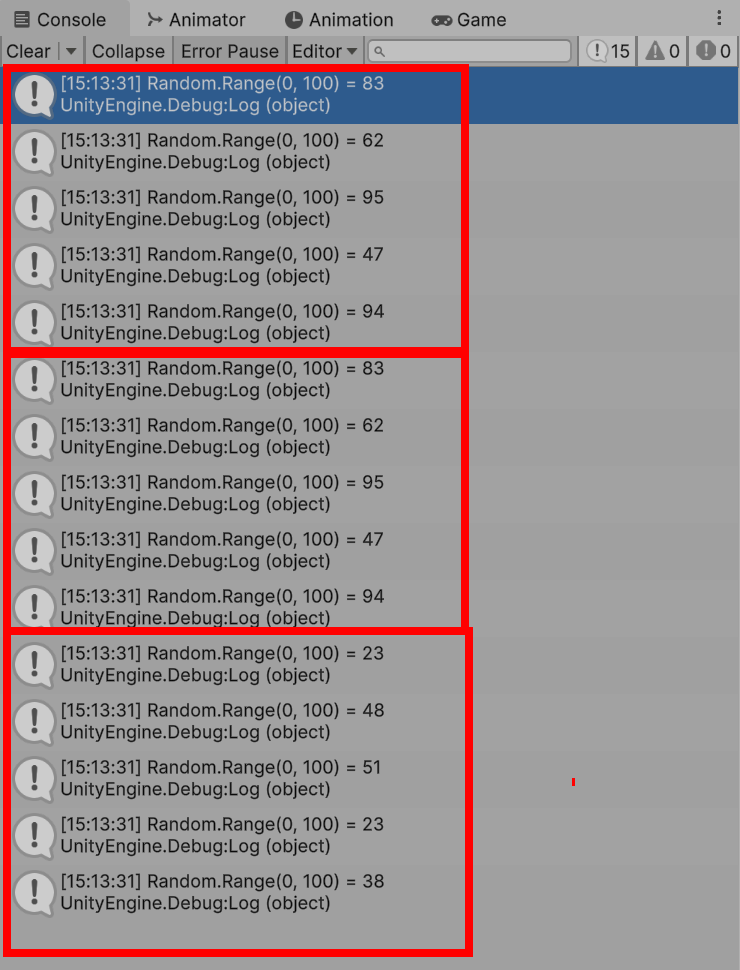 3)아래 스크립트의 두 반복문에서 서로 다른 무작위 값을 출력합니다. 두 번째 반복문의 출력이 첫 번째와 다른 이유는 Random.Range()가 호출될 때마다 전역 난수 상태가 소모(시퀀스 포인터가 이동)되기 때문입니다(UnityEngine.Random의 동작 원리 )
