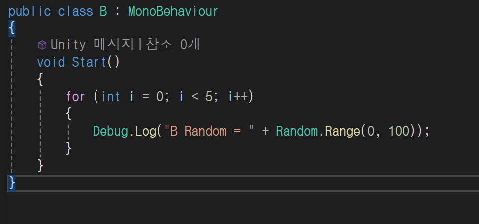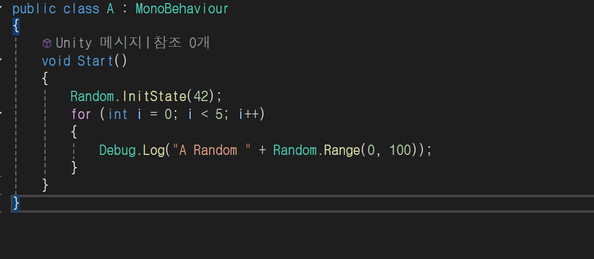 5)Unity의 Random은 전역 상태를 공유하며 아래에서 서로 다른 두 스크립트(A, B)는 같은 난수 스트림을 이어서 사용합니다.