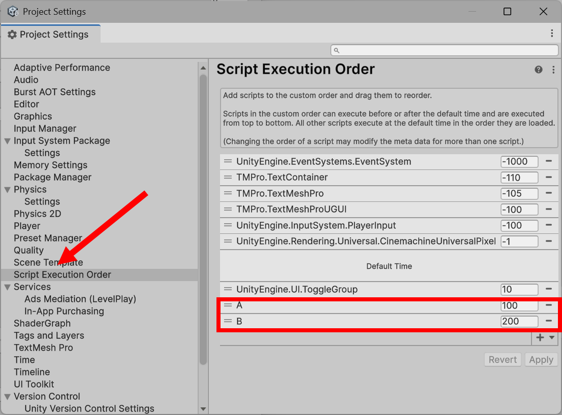 6)스크립트 실행 순서(Script Execution Order)에서 A 스크립트가 먼저 실행되도록 설정합니다.