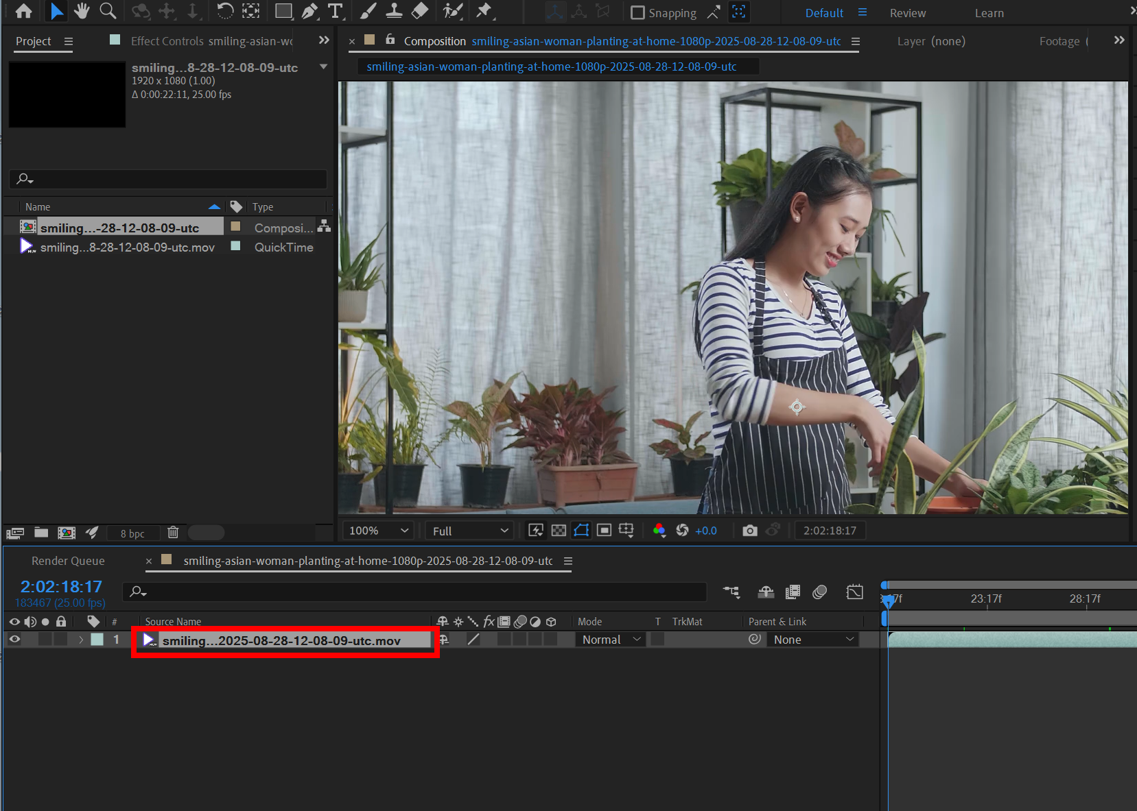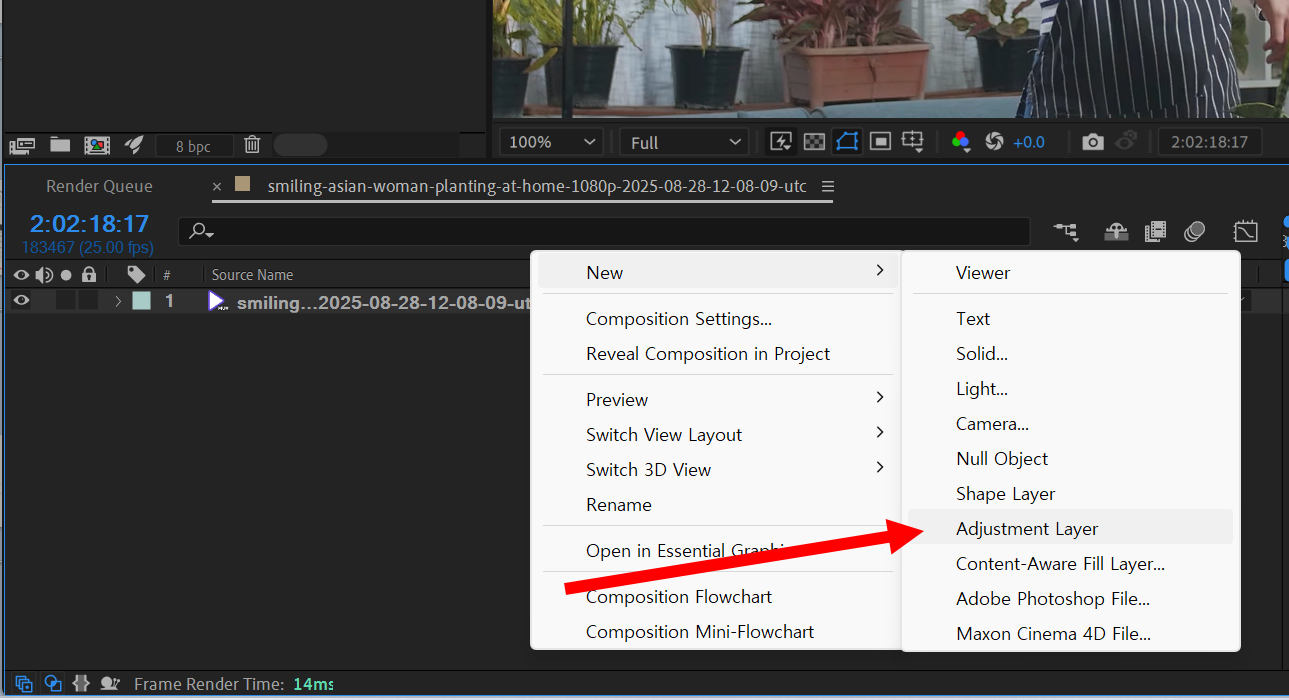 1)에프터이펙트에서 동영상을 가져오기하고(import) 동영상 푸티지의 새로운 컴포지션을 생성합니다.