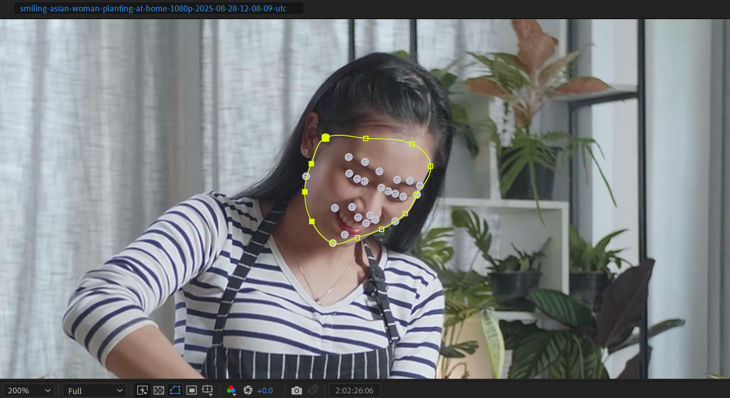 17)Face Tracking으로 인물의 얼굴을 추적하여 생성한 Mask Path의 키프레임 애니메이션에 Blur 효과가 적용된것을 확인할수있습니다.