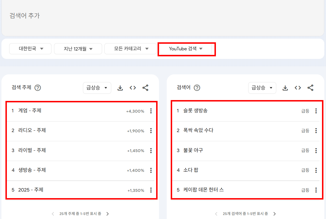 4)현재 유튜브에서 급상승한 검색 주제 및 검색어 키워드를 확인할수있습니다.