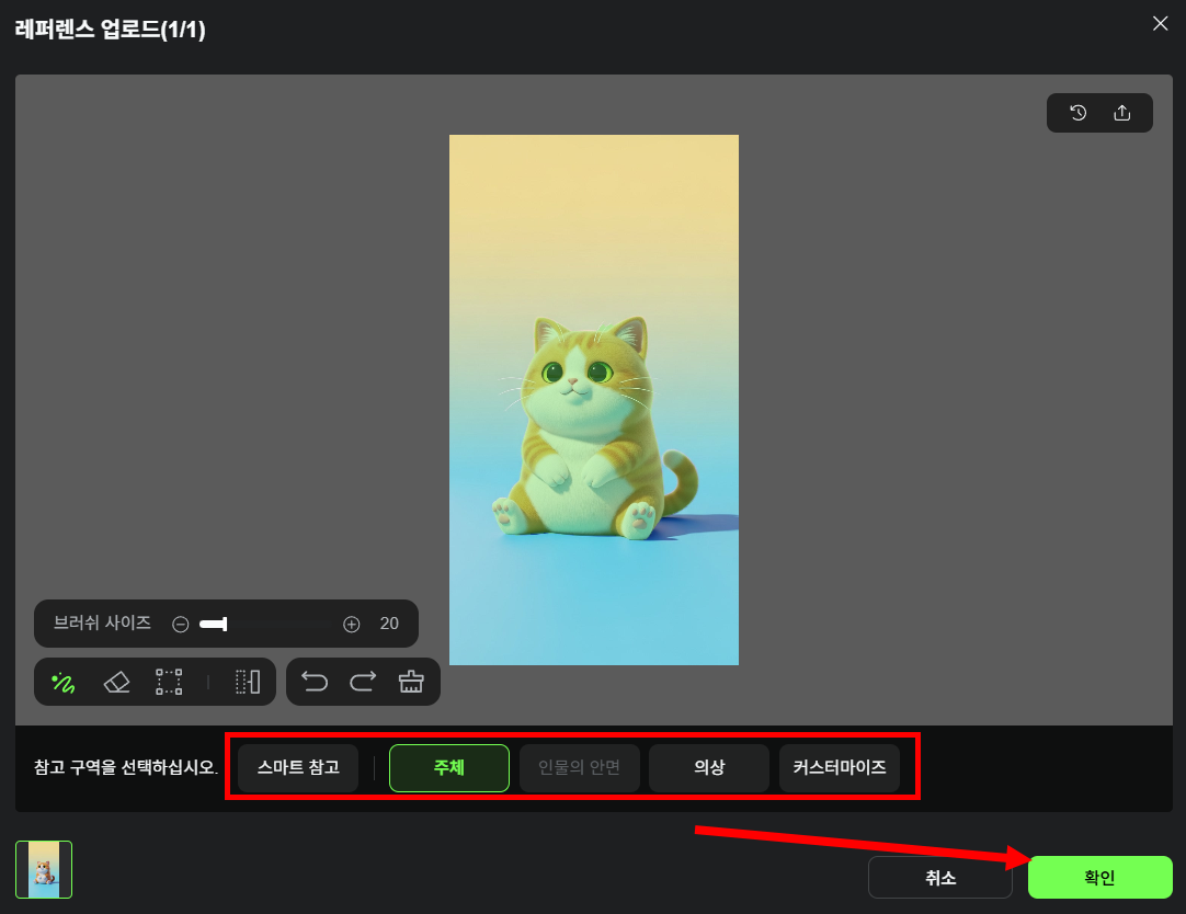 4)이미지에서 참고할 대상 (주체, 얼굴, 의상, 사용자정의등) 을 선택하고 확인합니다. 대상을 선택하면 이미지에서 자동으로 영역을 인식합니다.