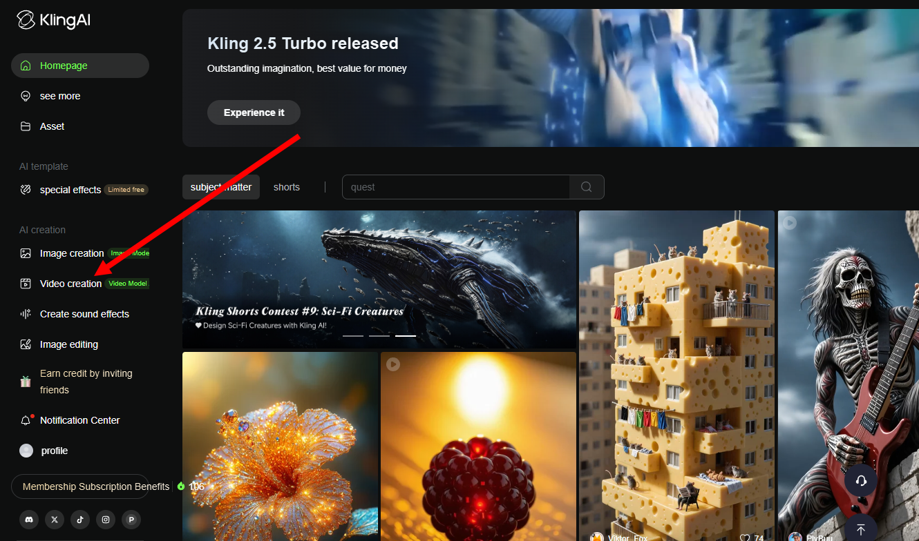 1)클링 AI(KlingAI) 웹사이트에서 계정 로그인하고 비디오 생성(Video Creation) 메뉴로 이동합니다.