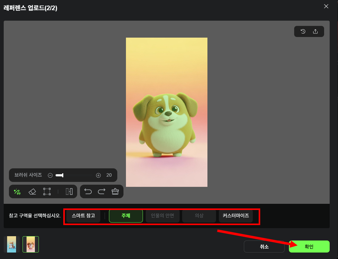 4)이미지에서 참고할 대상 (주체, 얼굴, 의상, 사용자정의등) 을 선택하고 확인합니다. 대상을 선택하면 이미지에서 자동으로 영역을 인식합니다.
