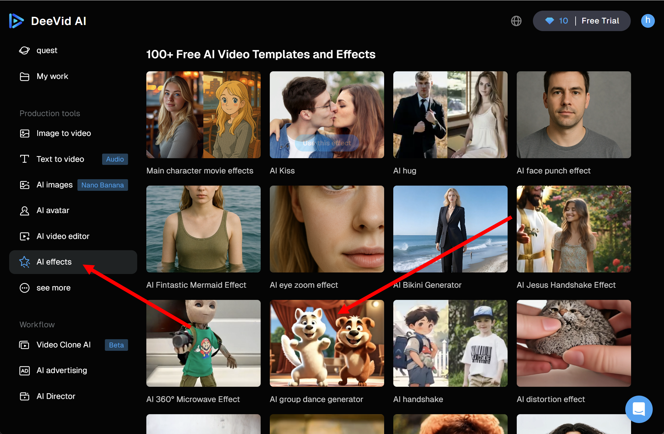Deevid AI에서 댄스 이펙트를 사용하여 고양이 춤추는 동영상 만들기