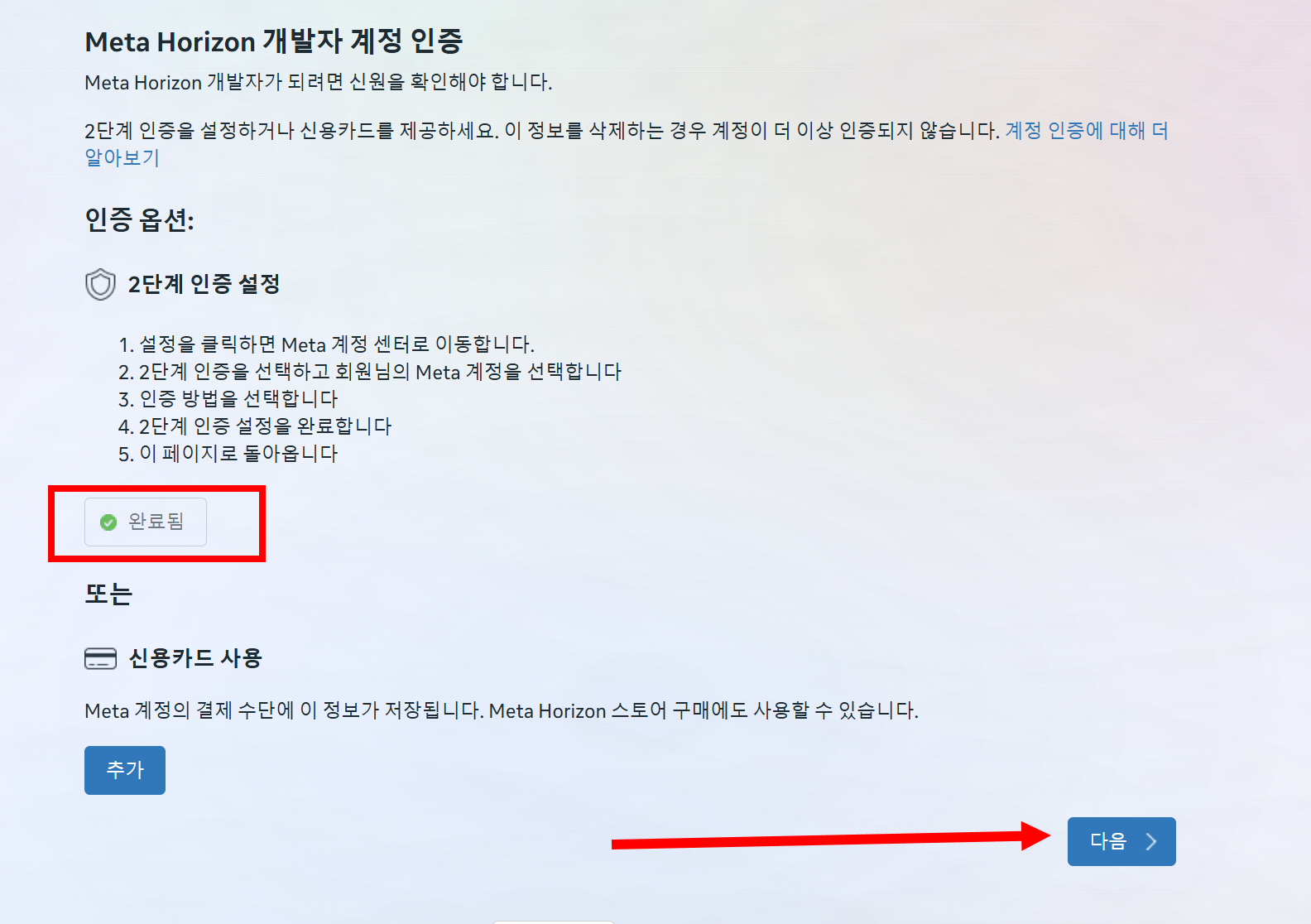메타 XR 게임 개발을 위한 Meta Horizon 개발자 계정 인증