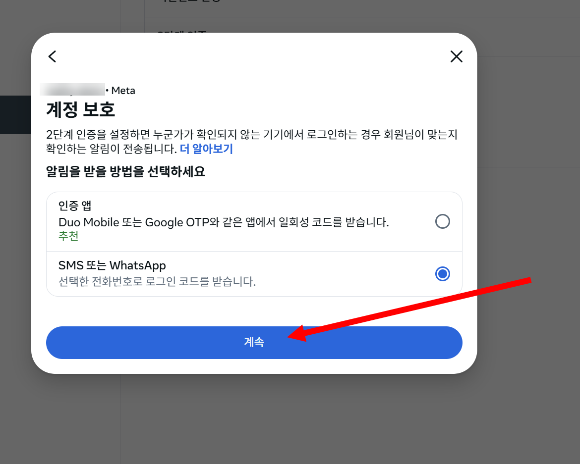 2)계정 보호를 위한 2단계 인증 방법을 선택하고 계속하기를 선택합니다. 전화번호로 로그인 코드를 확인하려면 SMS 또는 WhatsApp 옵션을 선택합니다.