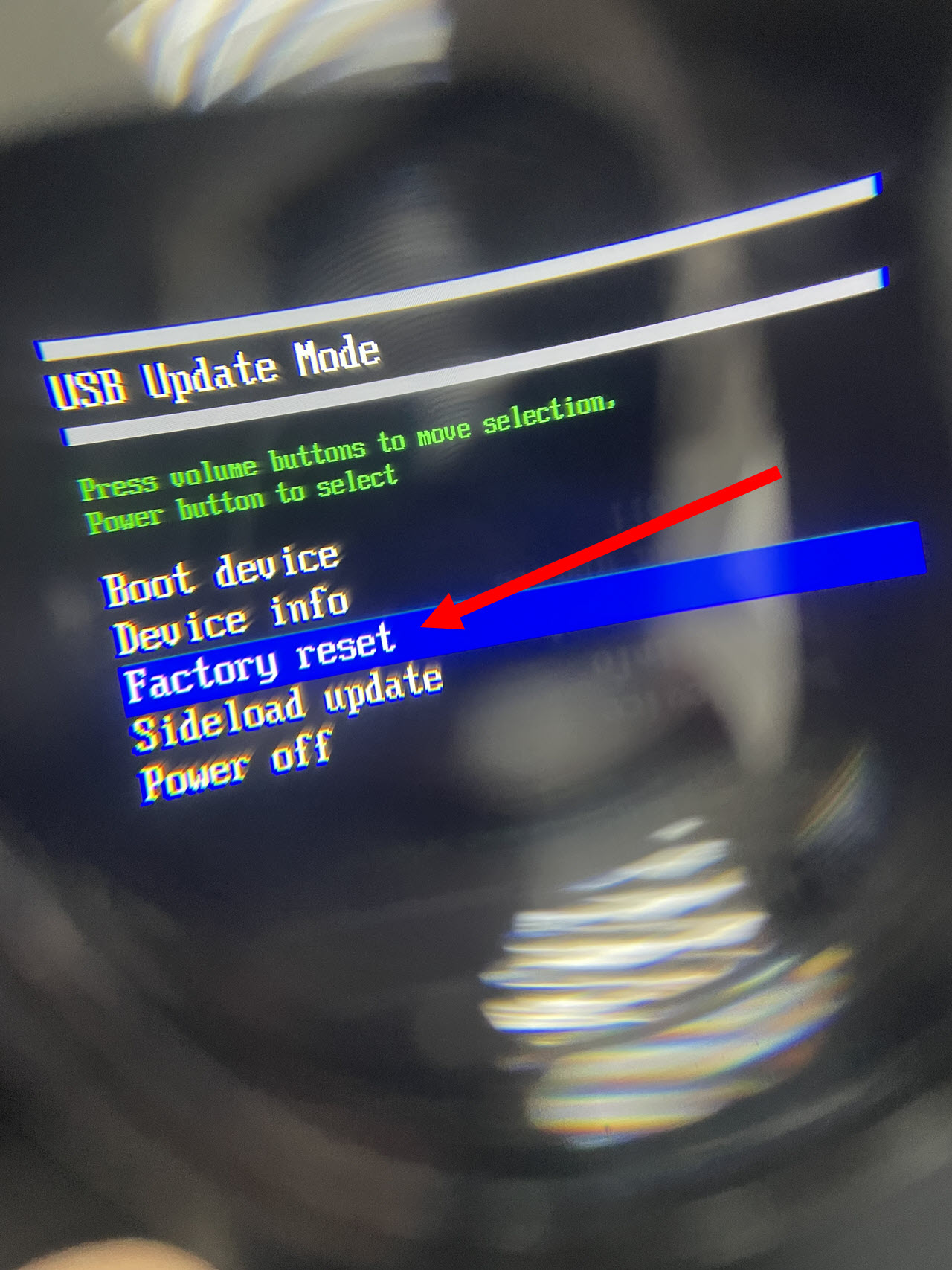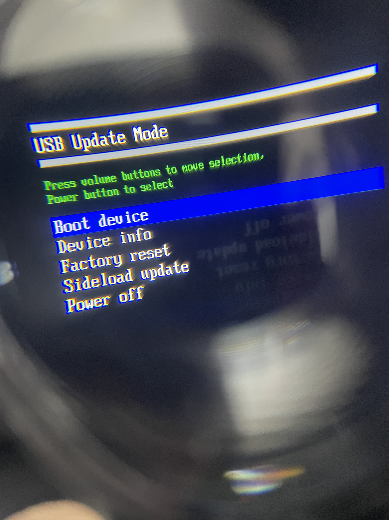 2)부트 메뉴(USB Update Mode)로 진입한것을 확인할수있습니다. 헤드셋의 볼륨 버튼을 사용하여 메뉴를 상하 이동하고 전원 버튼을 사용하여 메뉴를 선택할수있습니다.