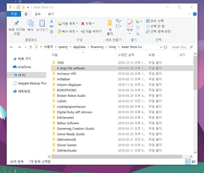 7)에셋은 퍼블리셔 이름의 폴더에서 .unitypackage 파일형식으로 존재한다.