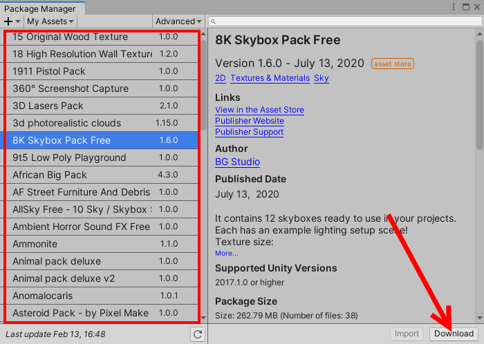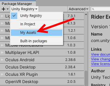 4)패키지매니저에서 좌측 상단에서 my assets을 선택하면 에셋스토어에서 구매한 에셋 목록을 표시한다.