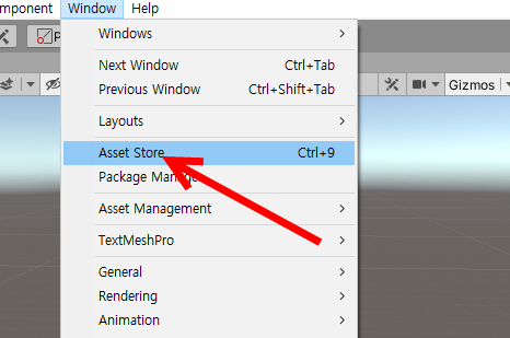 1)유니티 상단의 window 메뉴에서 asset store를 선택한다.
