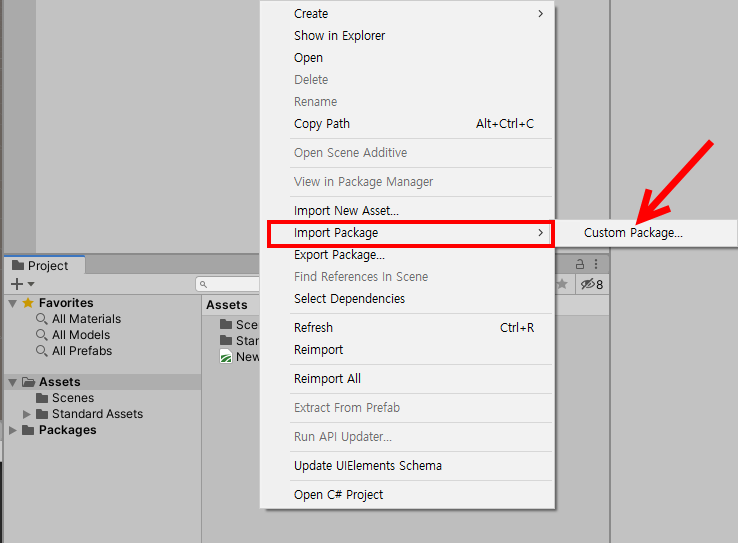 8)프로젝트에서 마우스 우클릭한후 import package의 custom packge에서 에셋을(패키지파일)불러오기한다.