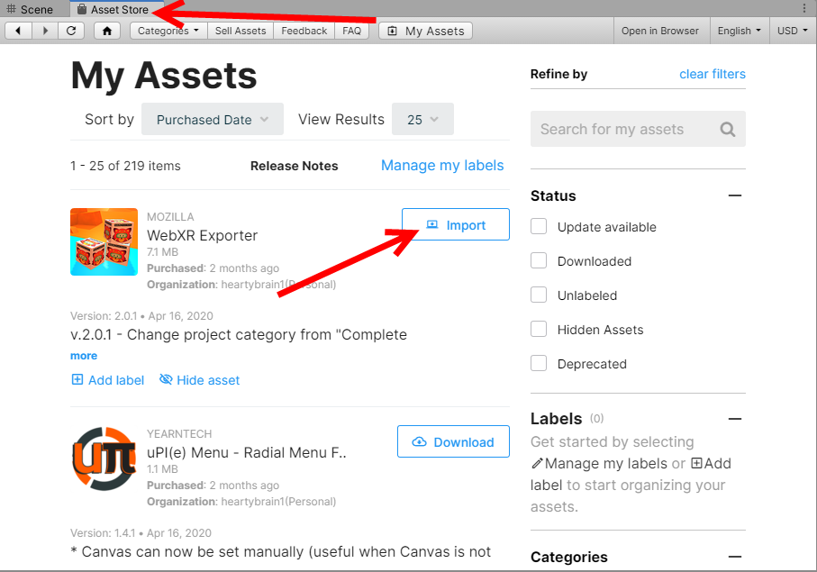 유니티 에셋스토어(asset store)에서 구매한 에셋을 불러오는 방법