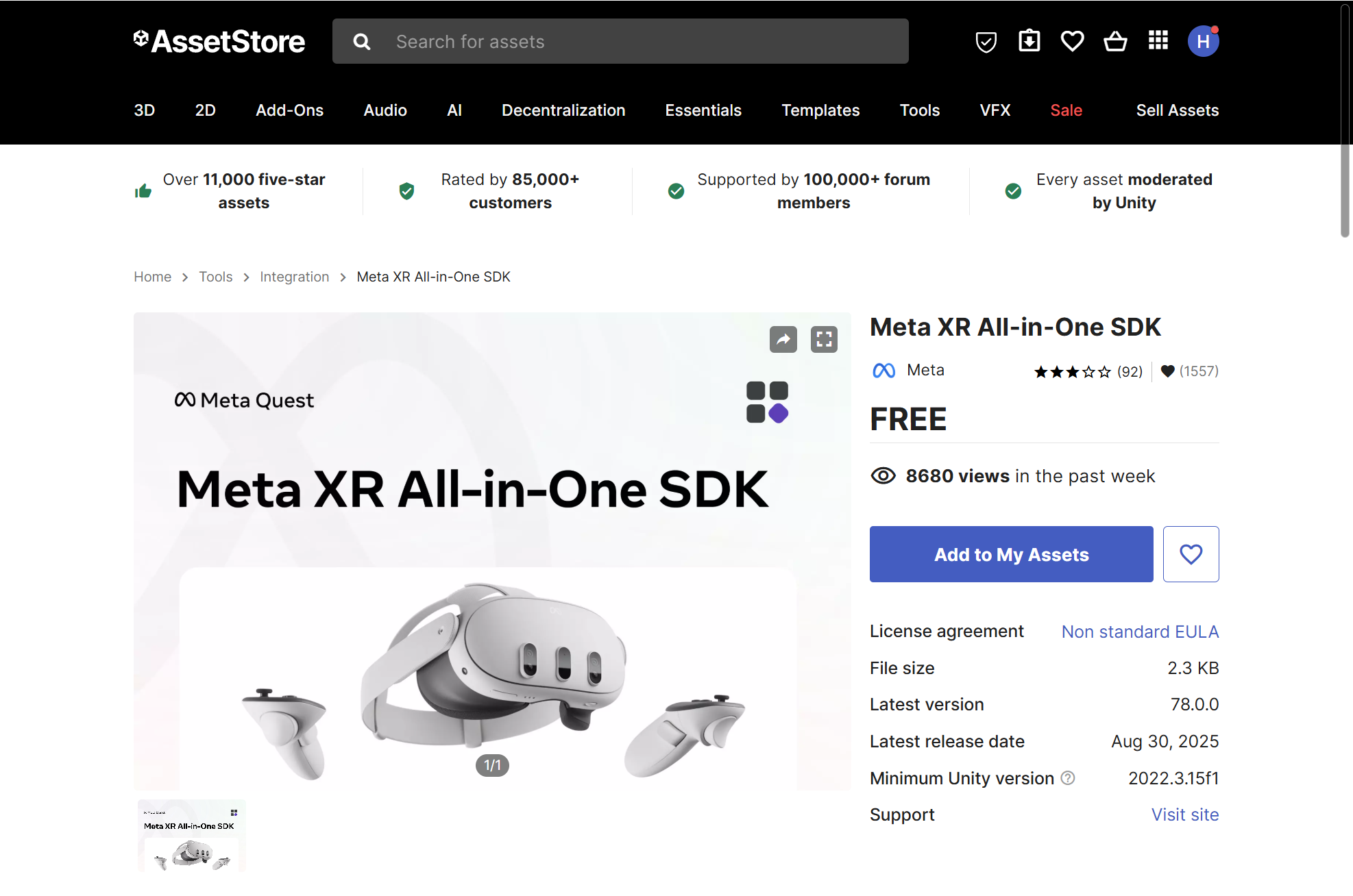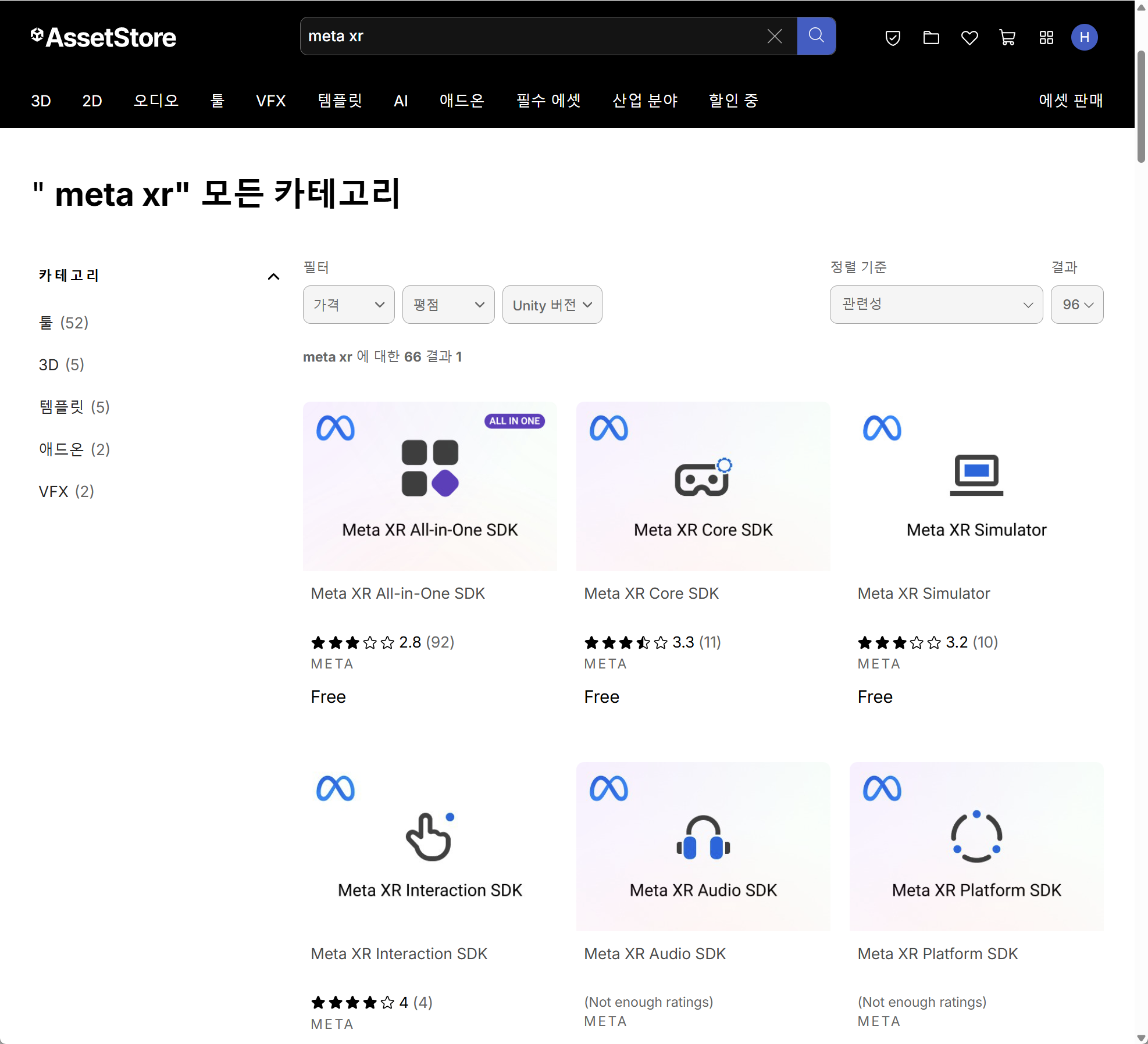 2)유니티 에셋스토어에서 Meta XR SDK를 검색합니다. Meta XR의 특정 기능만 추가할수있는 개별 SDK 목록과 전체 SDK 세트를 포함하는 Meta XR All-in-One SDK을 확인할수있습니다.