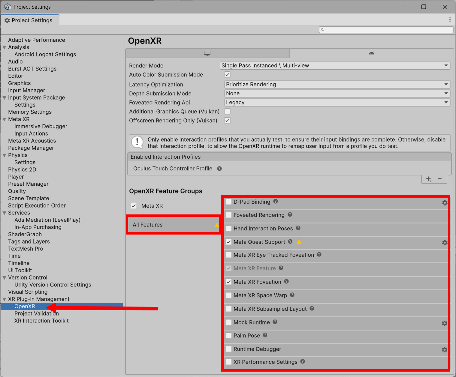 4)OpenXR Feature Groups에서 Meta XR Feature Set 기능을 활성화합니다.