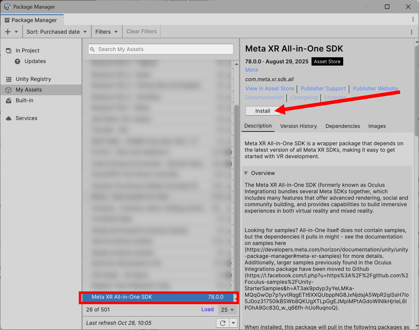3)Meta XR All-in-One SDK을 에셋으로 추가하고 프로젝트에서 에셋 다운로드 및 설치합니다.