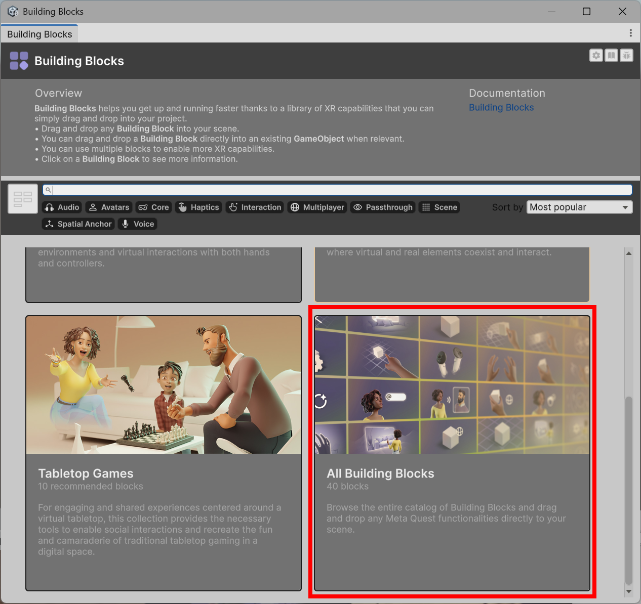 13)Building Blocks을 사용하면 사전설정된 블록 단위를 씬에 추가하는 방법으로 Meta XR의 특정 기능들을 구현할수있습니다.