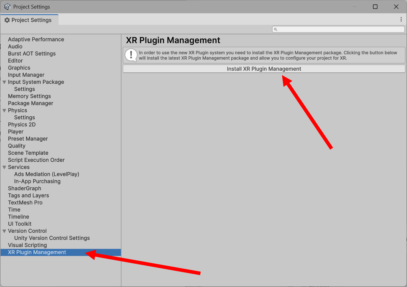1)프로젝트 설정(project settings)의 XR Plugin Management에서 Install XR Plugin management를 클릭하여 XR 플러그인 관리자를 설치합니다.