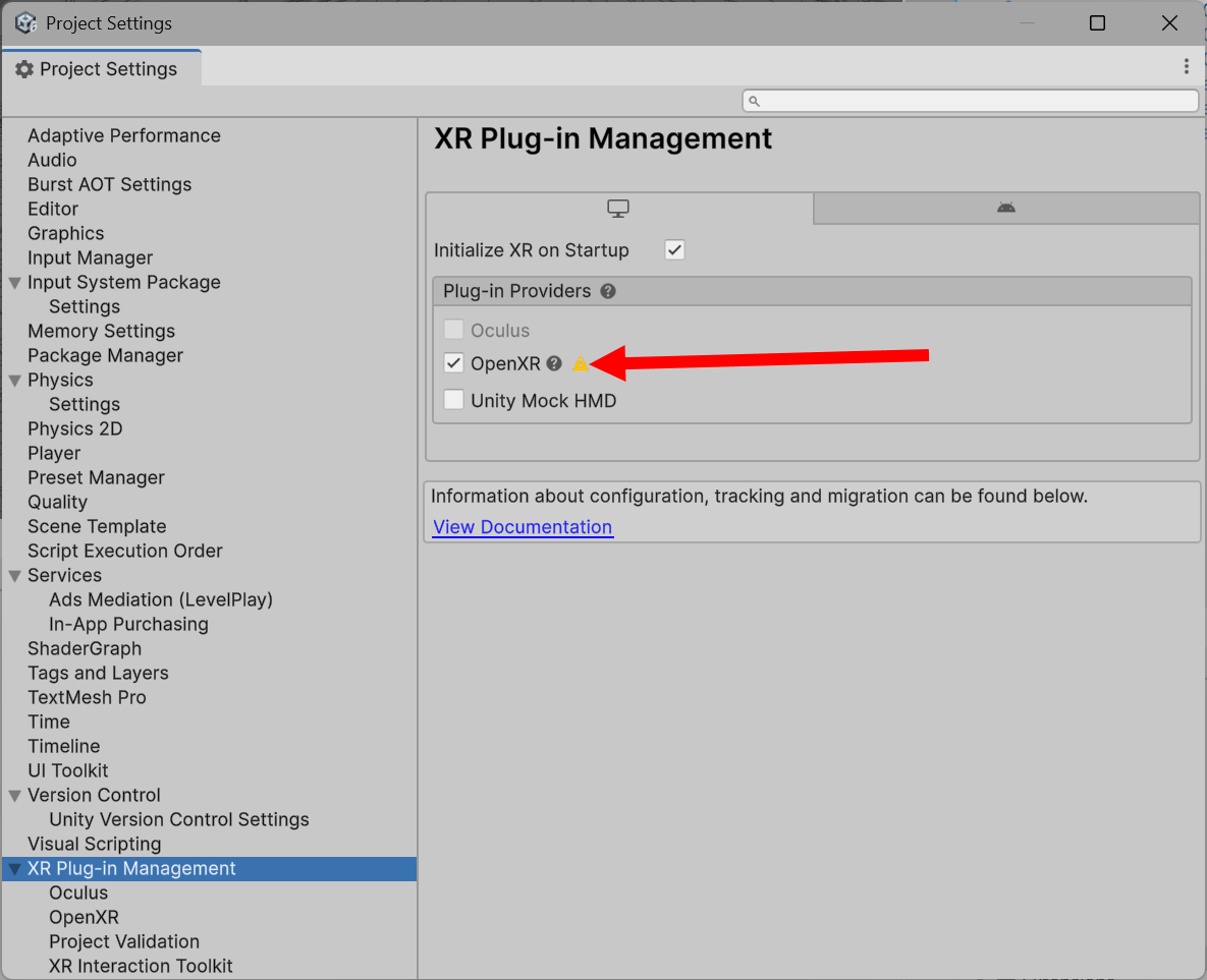 2)XR Plugin management 메뉴의 플러그인 공급자(Plug-in Providers)에서 OpenXR 플러그인을 활성화합니다.