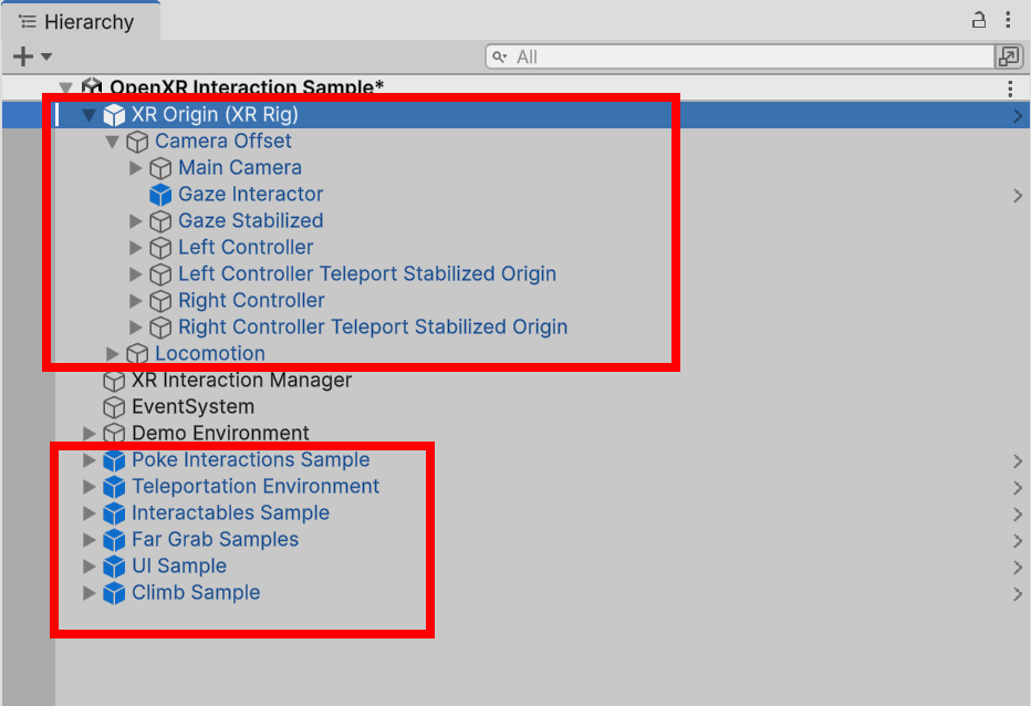 6)카메라와 컨트롤러를 포함하는 리깅된 객체인 XR Origin(XR Rig)와 다양한 방법으로 상호작용가능한(Interactable) 객체 샘플들이 존재합니다.