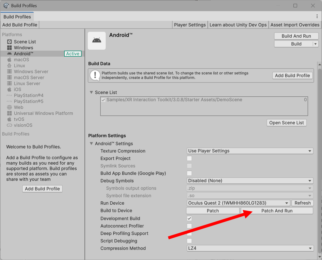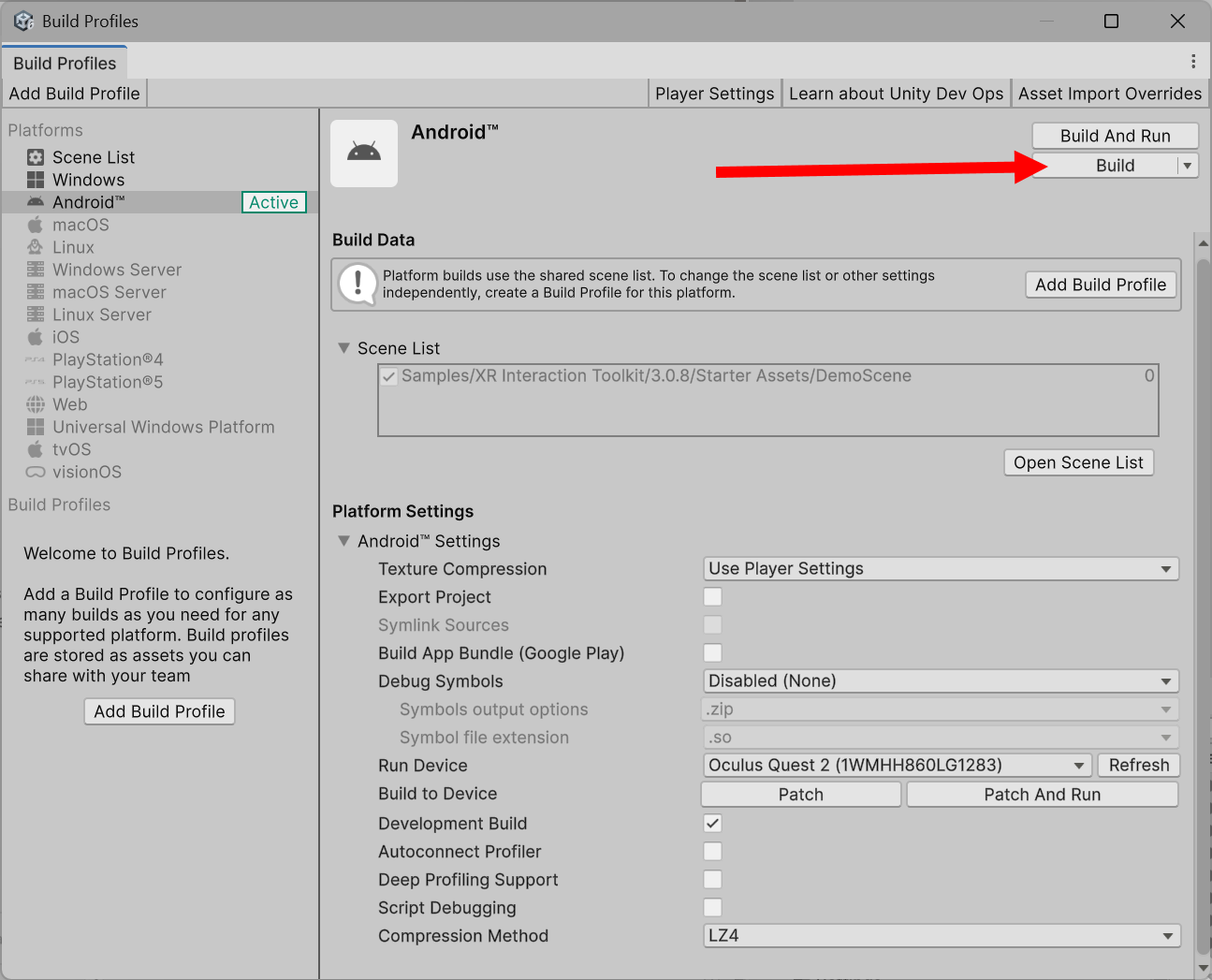 9)현재 연결된 메타 퀘스트 장치에 앱을 빌드하고 실행하려면 Build to Device의 Path And Run을 선택합니다.