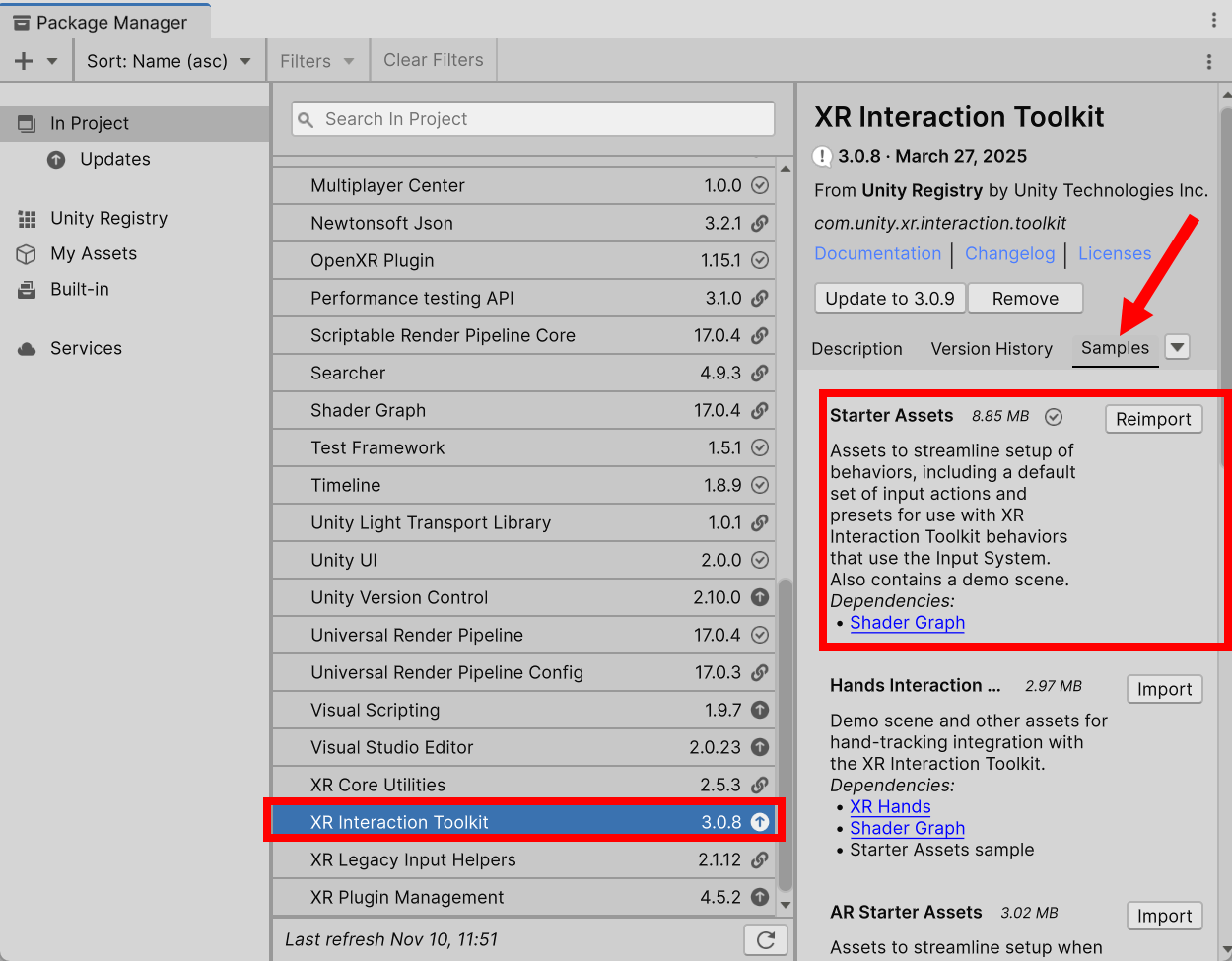 3)XR Interaction Toolkit 패키지를 설치하고 Start Assets 샘플을 가져오기합니다.