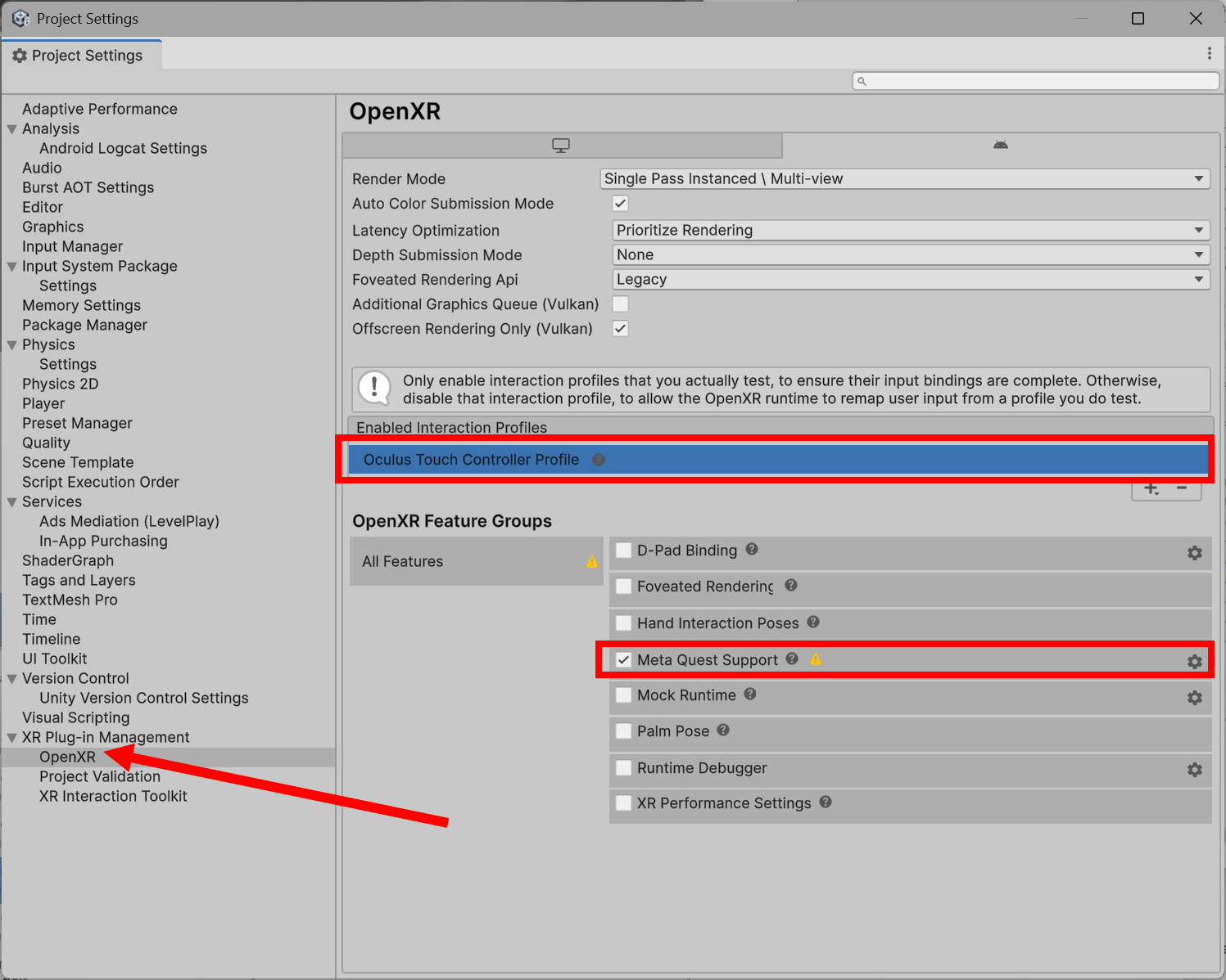 6)프로젝트 설정의 OpenXR 메뉴에서 Enabled Interaction Profiles에 오큘러스 터치 컨트롤러 프로필 (Oculus Touch Controller Profile) 을 추가하고 OpenXR Feature Groups에서 Meta Quest Support 에 체크합니다.