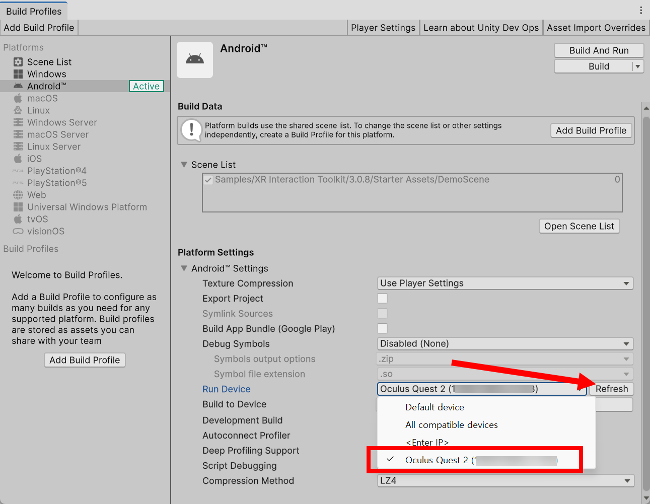 7)빌드 설정에서 해당 씬을 추가하고 현재 메타 퀘스트 장치가 연결 및 정상적으로 표시되는지 확인합니다.