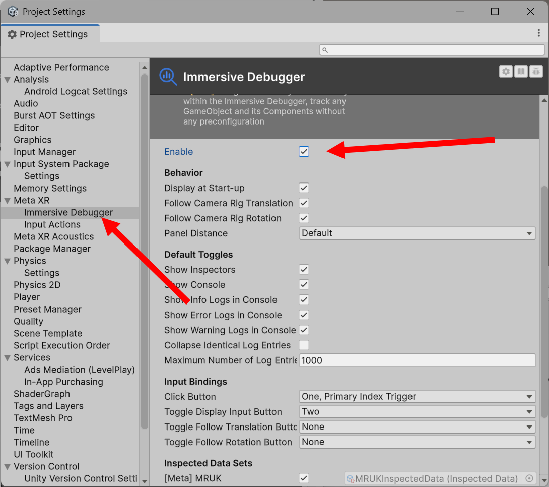 메타 퀘스트 헤드셋에서 Immersive Debugger를 표시하려면 프로젝트 설정의 Meta XR 메뉴 하위 Immersive Debugger에서 Enable에 체크합니다.