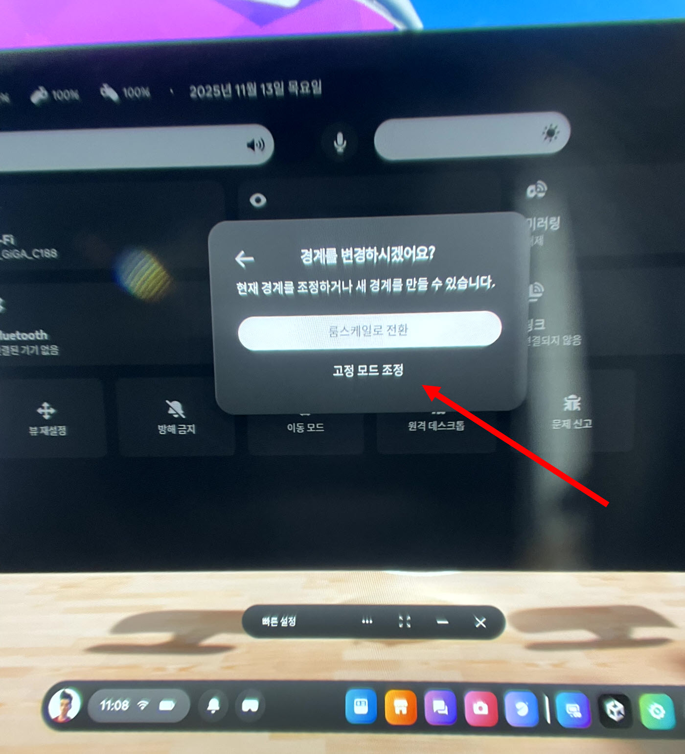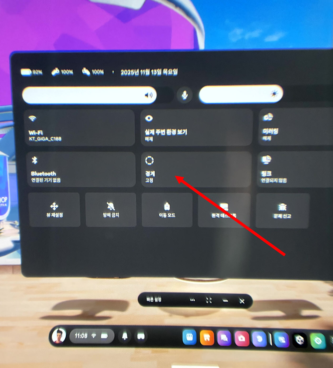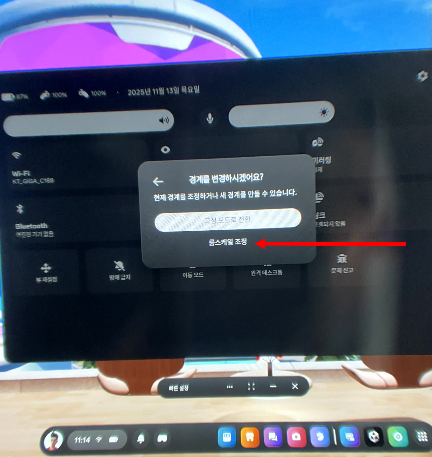 1)메타 퀘스트 헤드셋에서 빠른 설정 메뉴의 경계(고정, 룸스케일) 로 이동합니다.