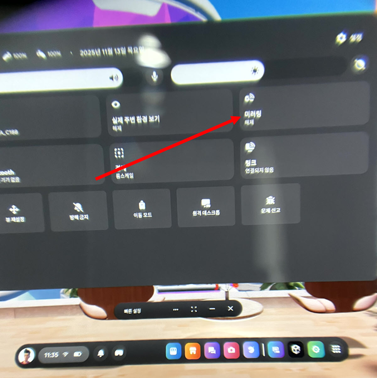 2)메타 퀘스트 장치 헤드셋의 디스플레이를 PC에서 표시하려면 빠른 설정 메뉴에서 미러링을 활성화합니다.